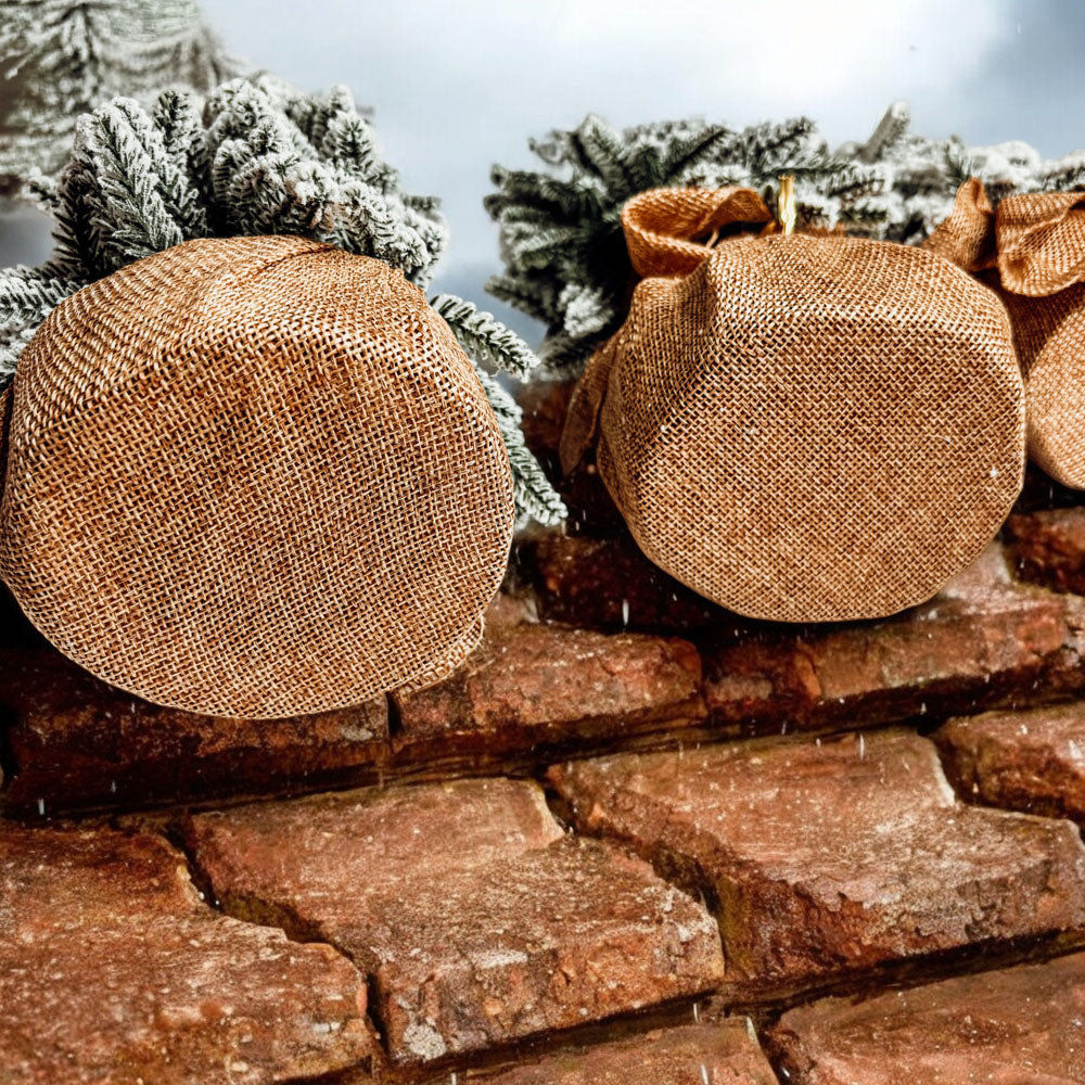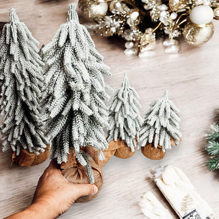 - 4 various sized Snow Covered Christmas Trees with Jute Covered Wooden Base