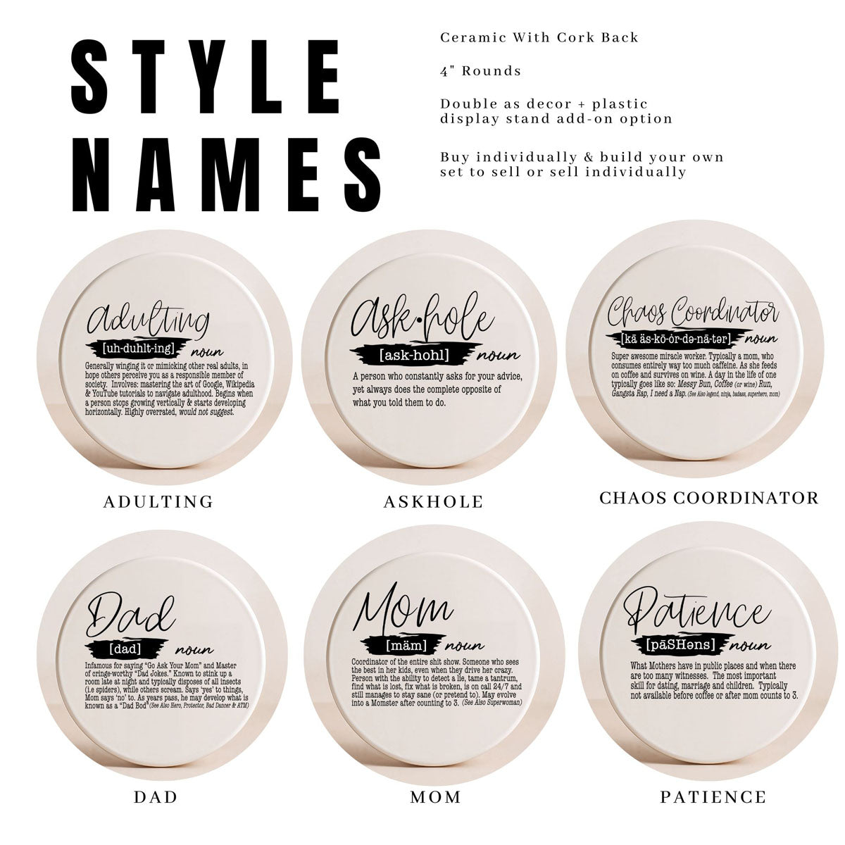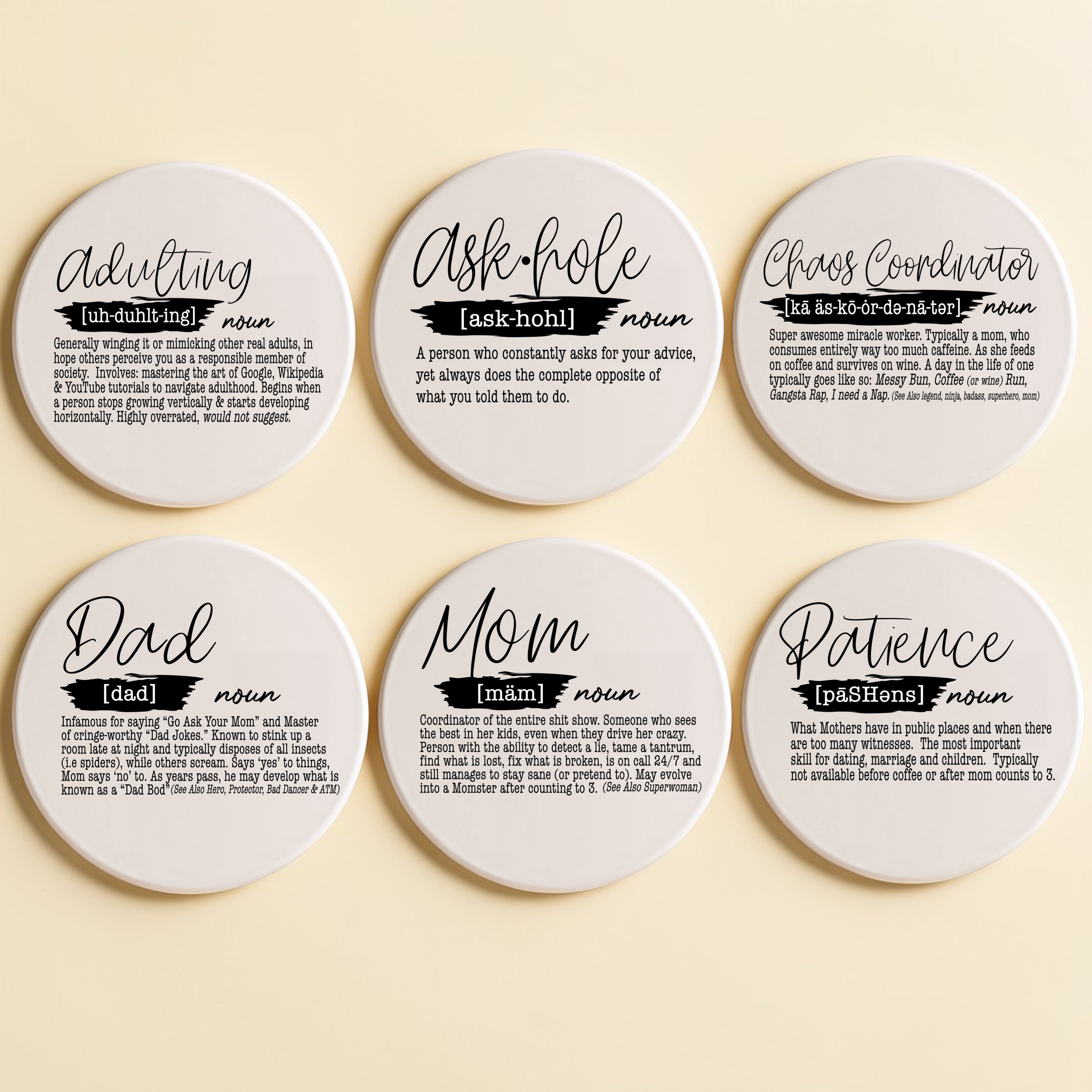 Finally, coasters that tell it like it is! These hilarious definition-style ceramic coasters are like Urban Dictionary meets your mom's favorite dictionary... but make it fancy. Perfect for anyone who needs a daily reminder that they're not the only one struggling with this whole "being a grown-up" thing.