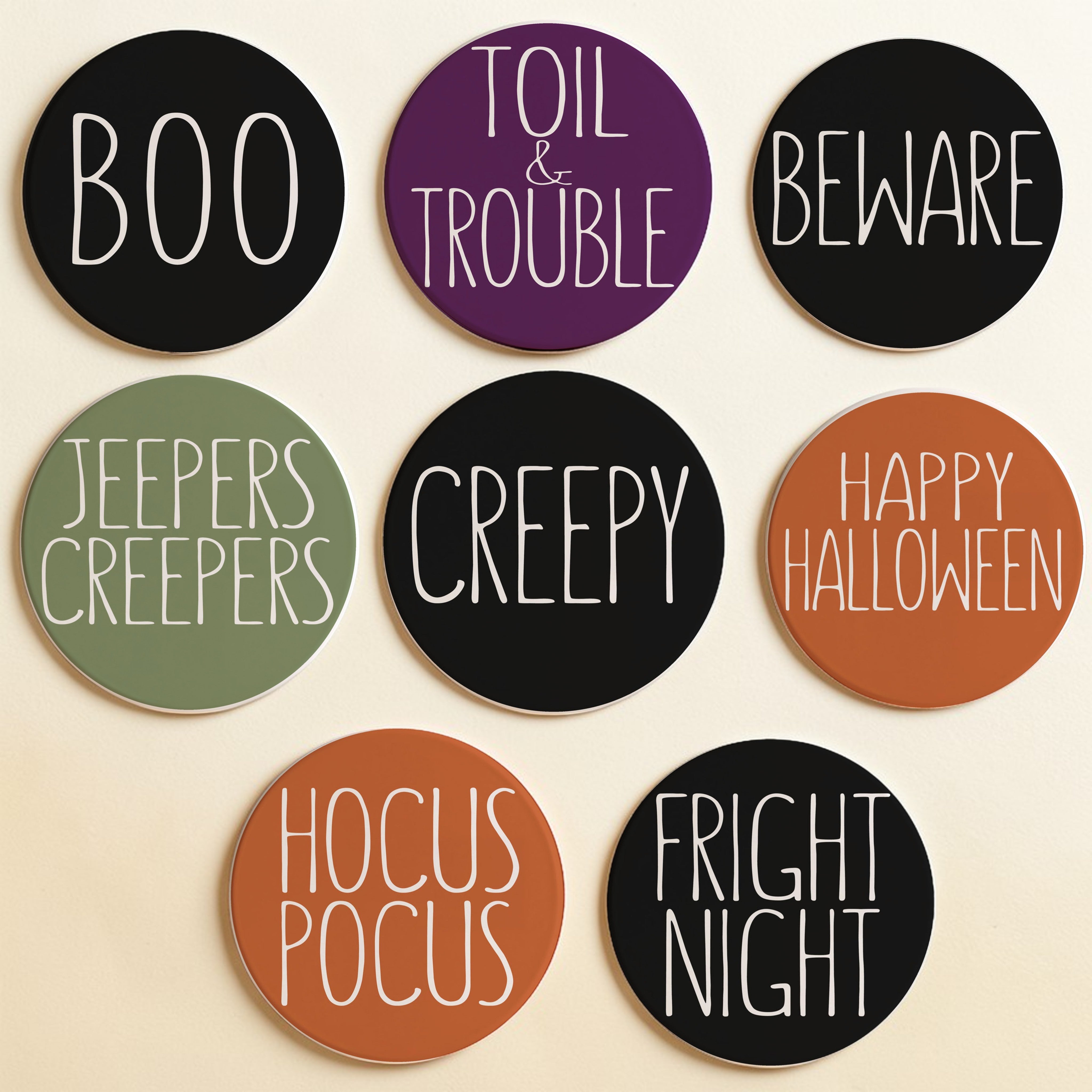 Each 4" coaster is crafted from durable ceramic with a protective cork backing – because the only scary thing should be the sayings, not the water rings on your furniture!