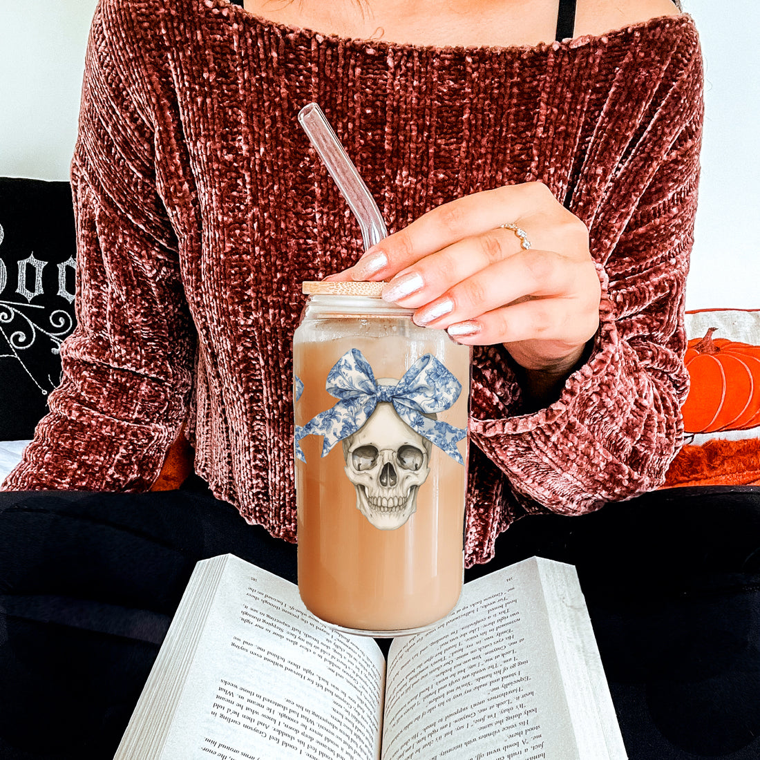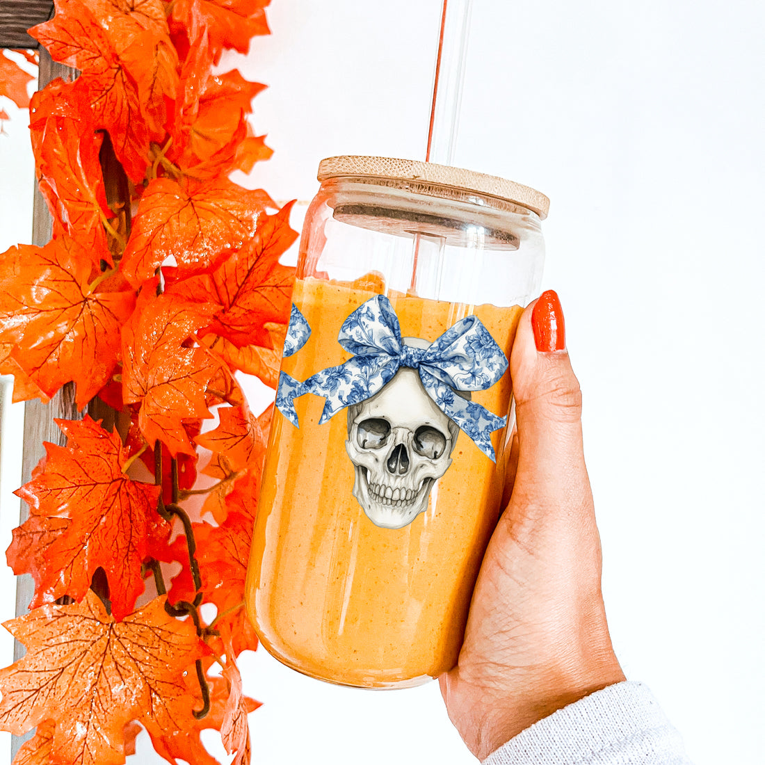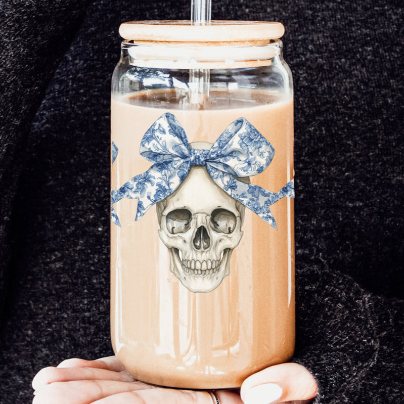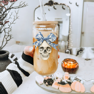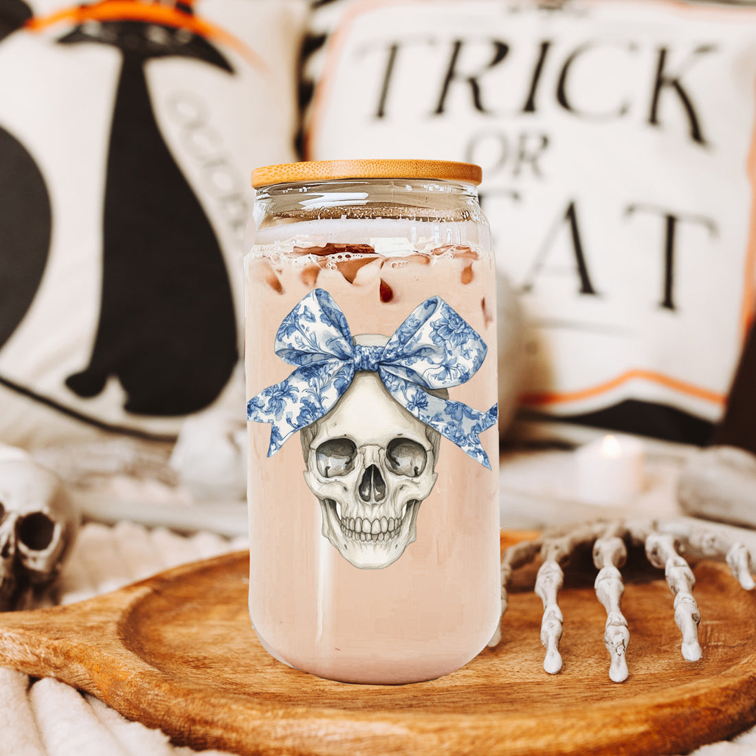 Meet the tumbler that proves being dead doesn't mean you can't be fabulous! This 20oz glass masterpiece features our signature skull wearing a gorgeous blue and white Chinoiserie bow - because who says the afterlife can't be stylish?