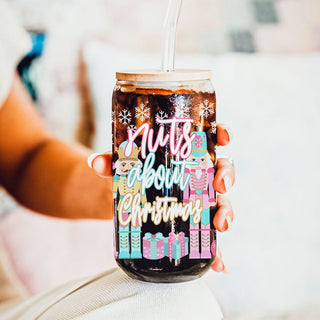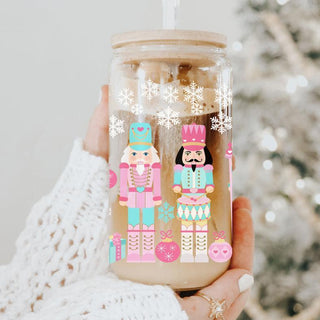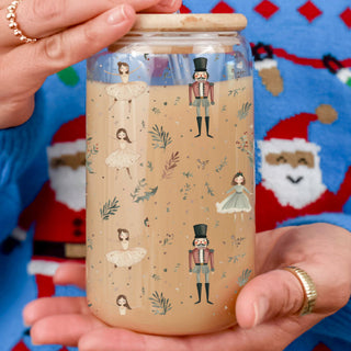Unique Christmas coffee cup – pastel glass tumbler with Nutcracker soldiers and ballerinas