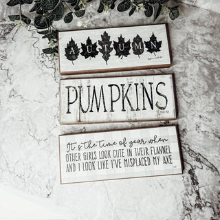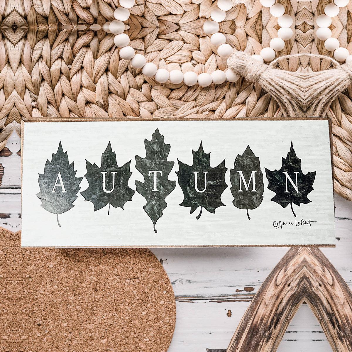 Rustic style off white Background with various shaped leaves with letters that spell out Autumn. Perfect sign for Neutral Interiors, Cottage, Farmhouse and even Modern style homes! Made to blend into any.