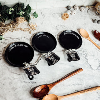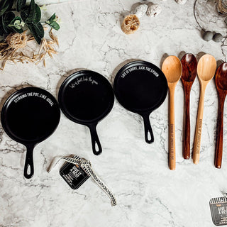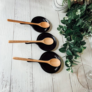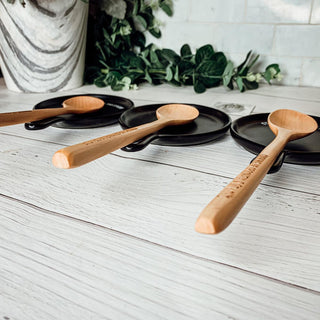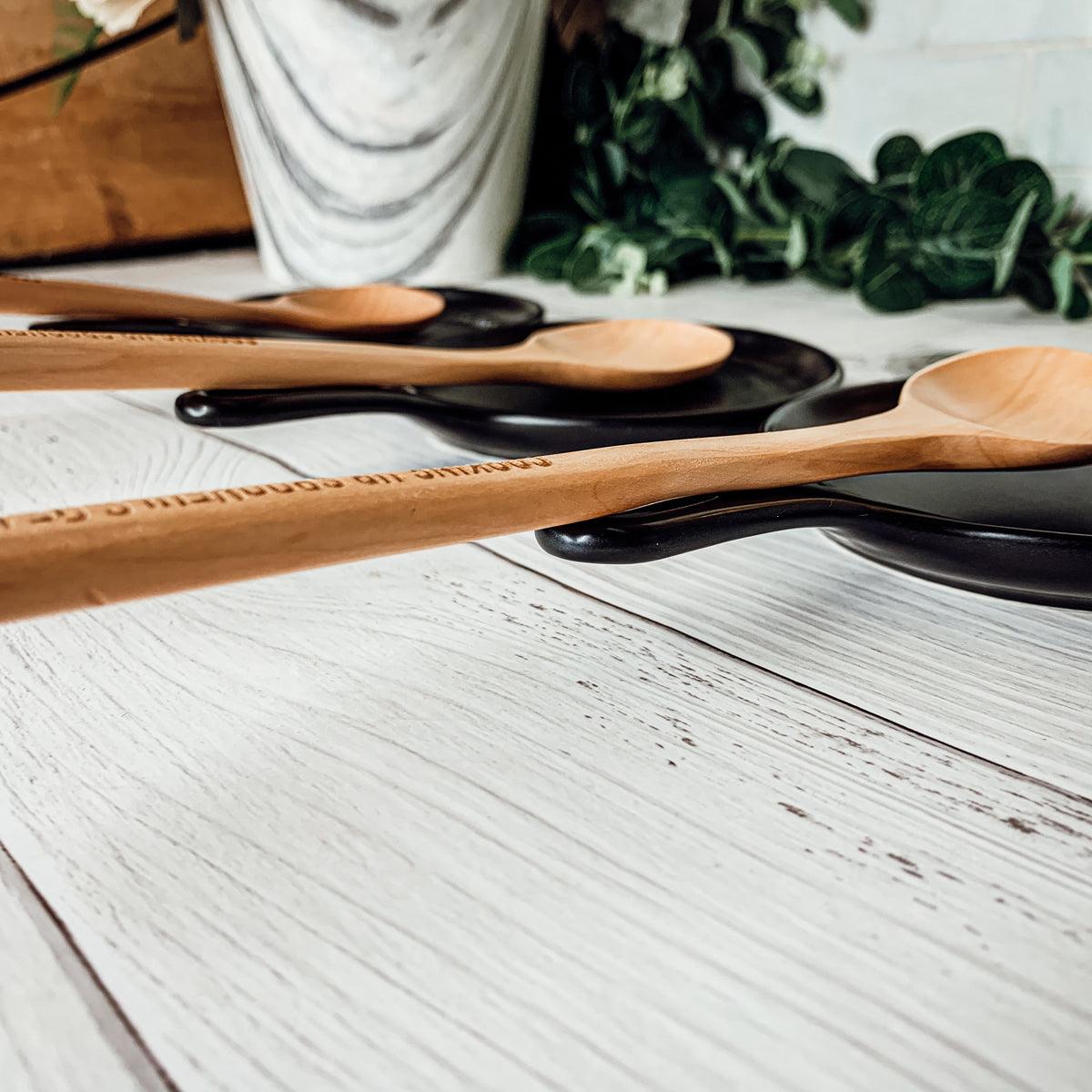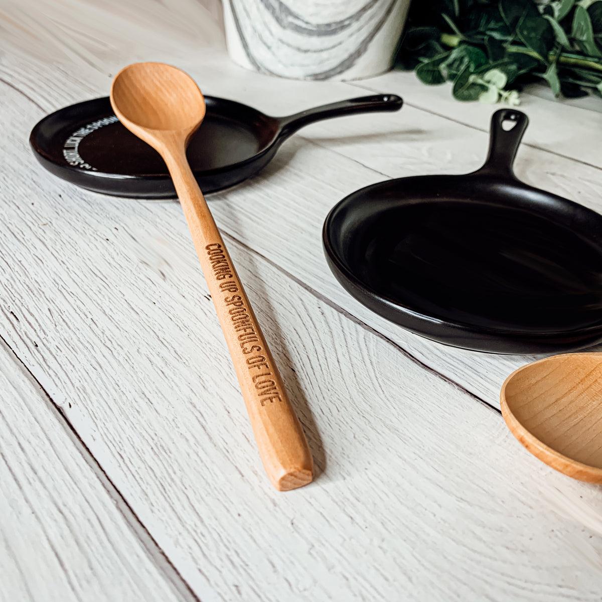 Choose your spoon too! Either a lighter wood spoon w/ quote "Cooking up spoonfuls of love" or a darker (semi thicker) spoon with no quote!