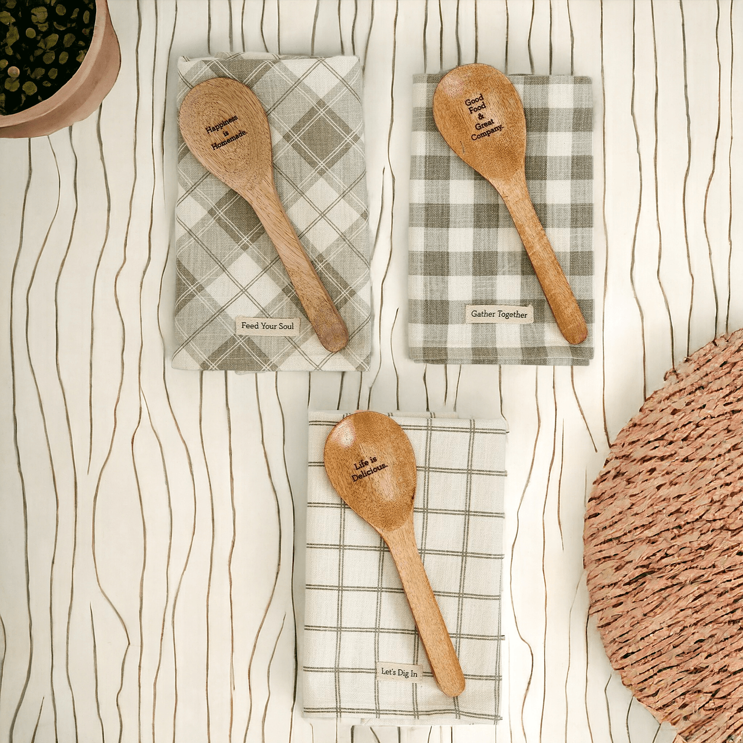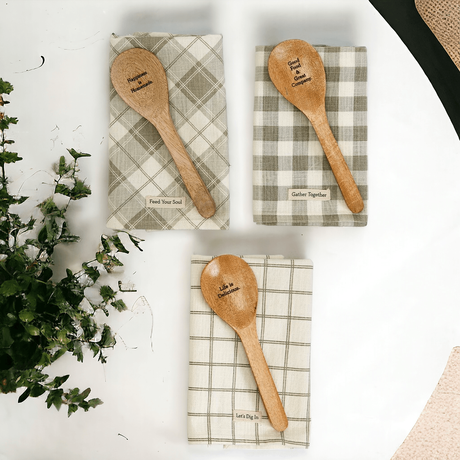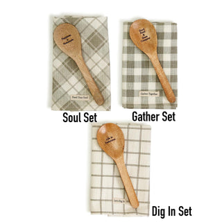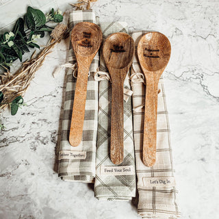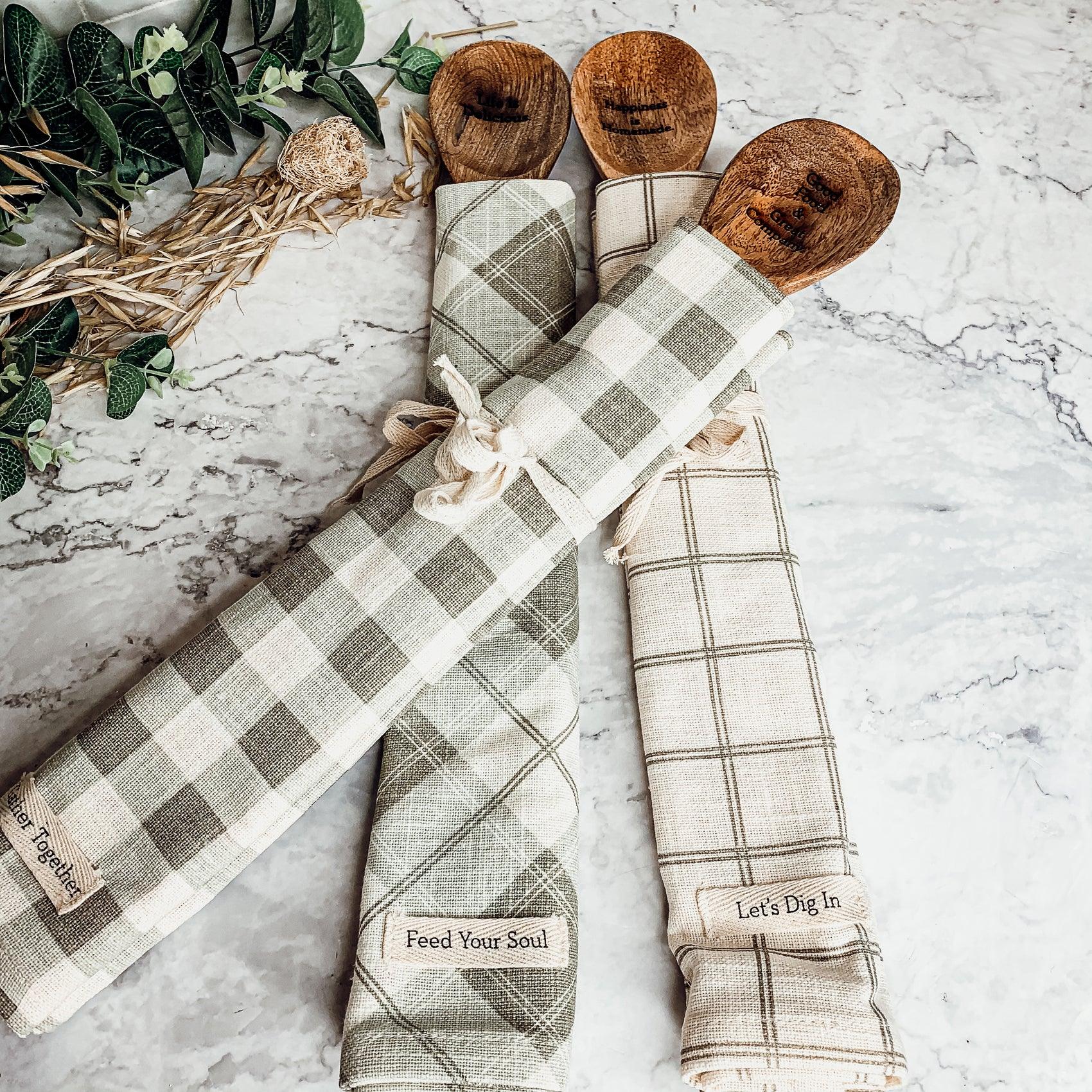 This charming spoon set is decorative and fully functional! Gift set includes checkered dish towel and wooden spoon with engraved lovable sayings. This set is a great housewarming and kitchen remodel gift. They also fit perfectly into stockings :)