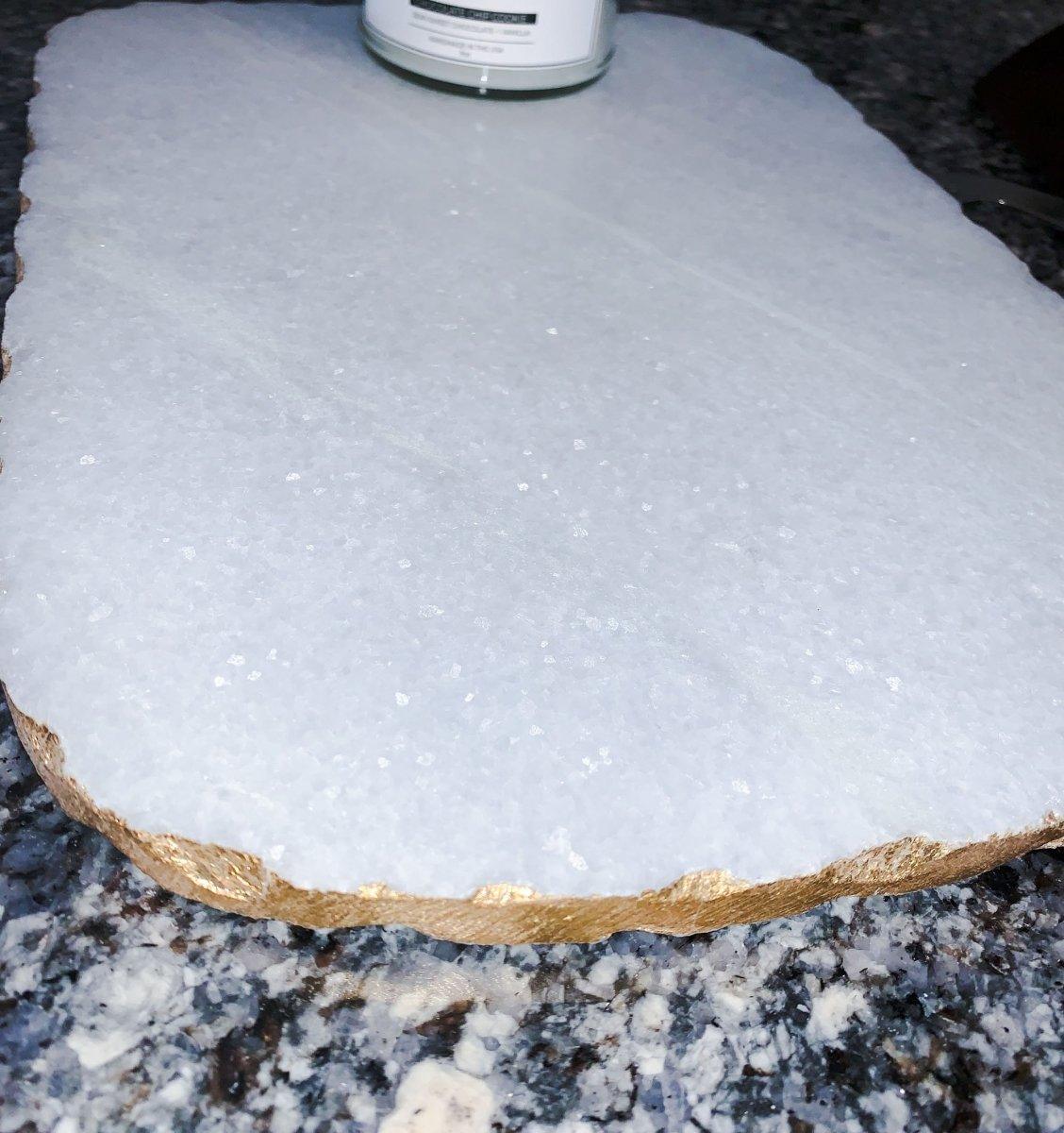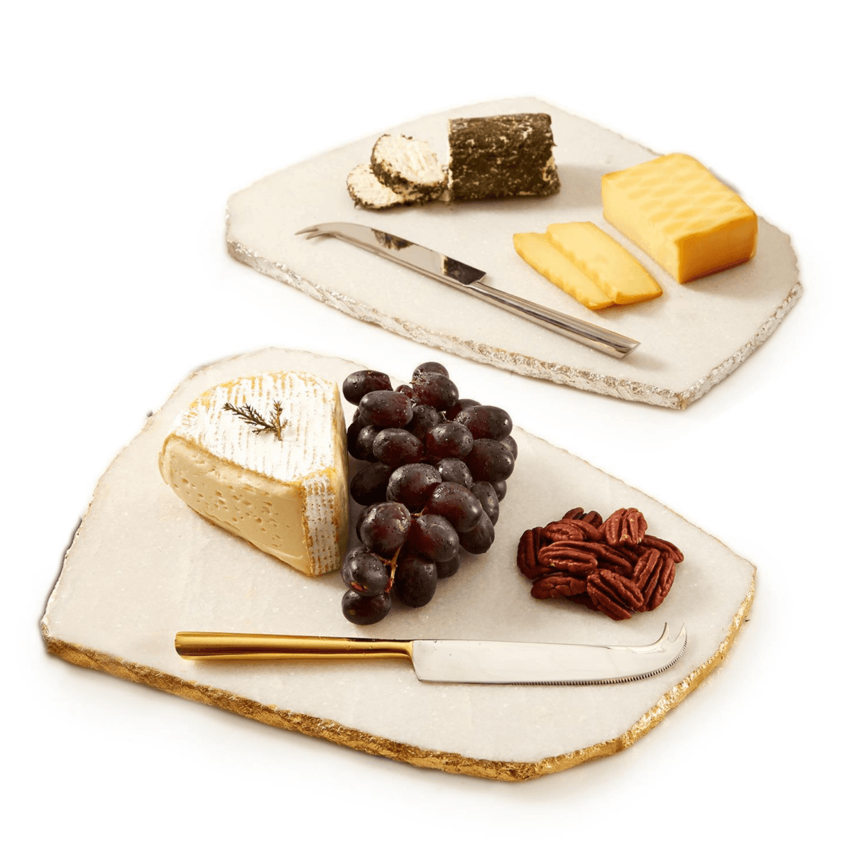 Impress your guests with our elegant Platinum Blonde White Marble Cheese board hand finished with a metallic edge. A Stainless Steel spreading knife is included and packed in a stylish suede pouch.