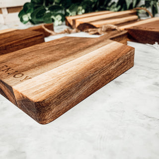 Charcuterie Boards are so popular today. Serve your friends and family a variety of cheeses, meats and nuts with these beautiful Acacia boards. Each board has a natural jute string attached to hang up in your kitchen to use whenever for easy storage!