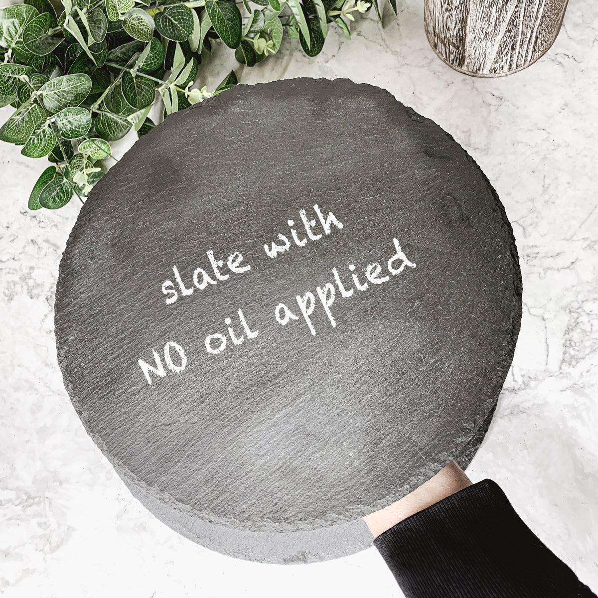 - If you have a slate coaster with lettering on it, the oil will not effect the brightness of the text (this is due to difference in applying our art on the slate)