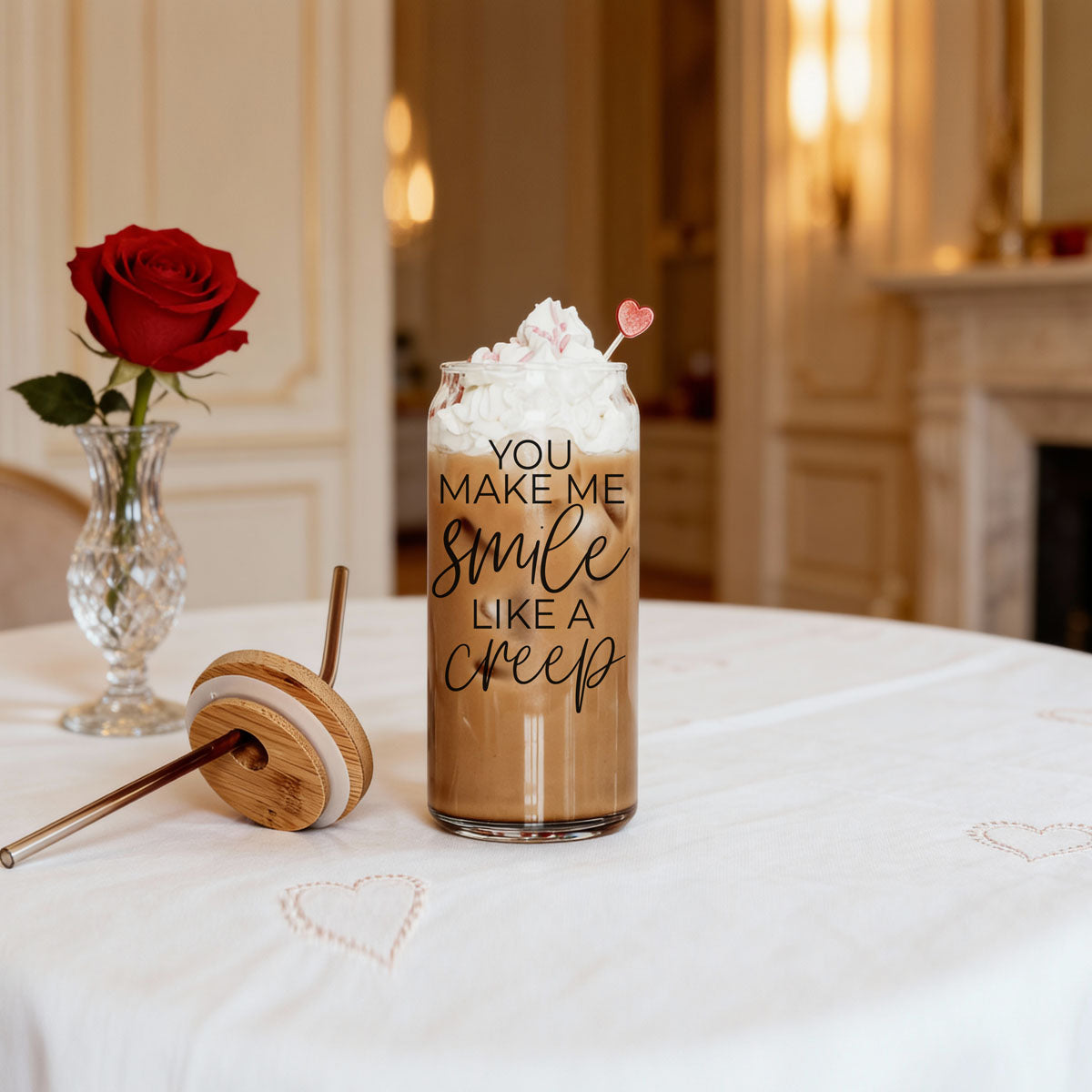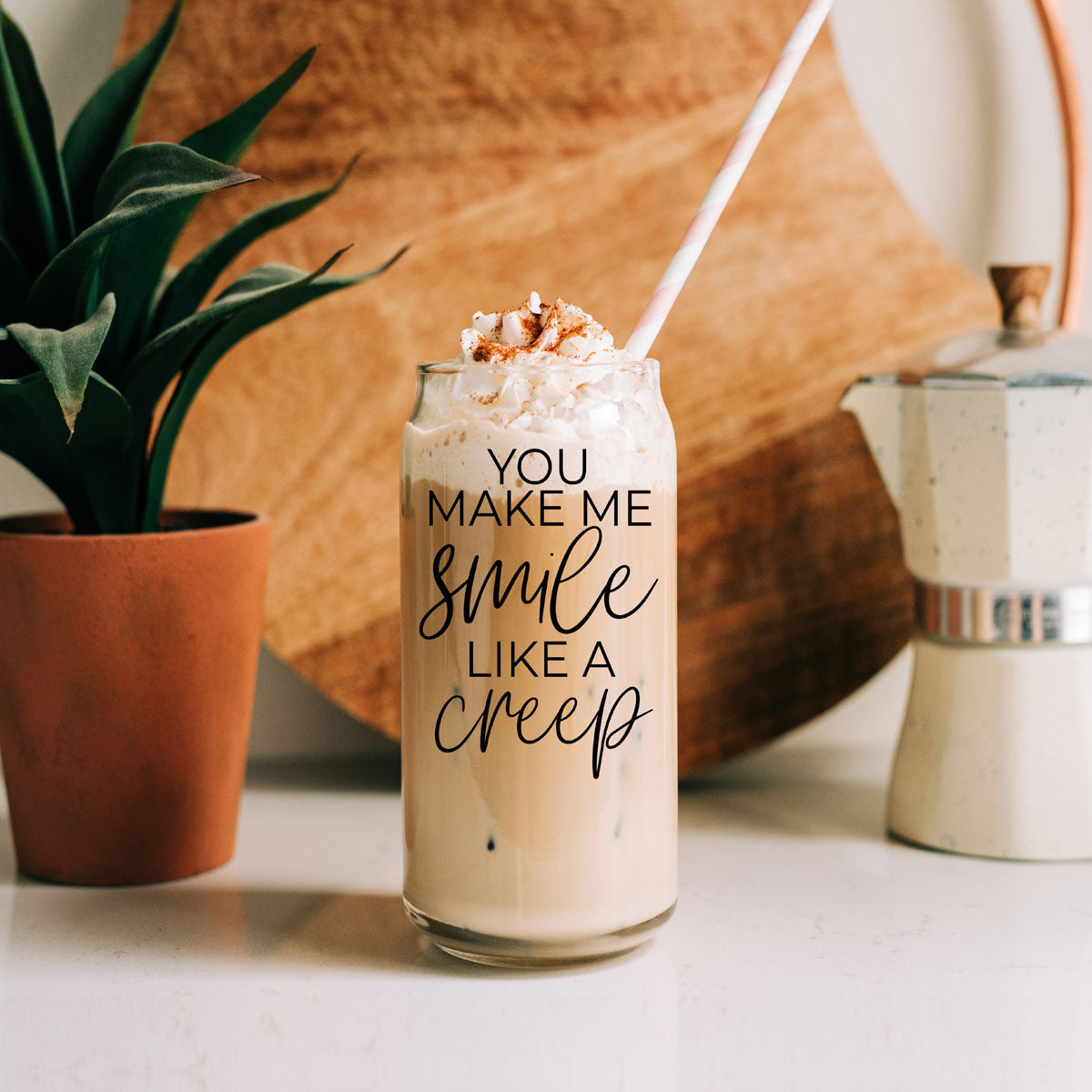 Sip with a side of sass! This 20oz glass cup hilariously proclaims “You Make Me Smile Like a Creep,” because let’s face it, we all have those moments when we can’t help but grin a little too wide. Perfect for those cheeky moods when you just can’t contain your inner weirdo!