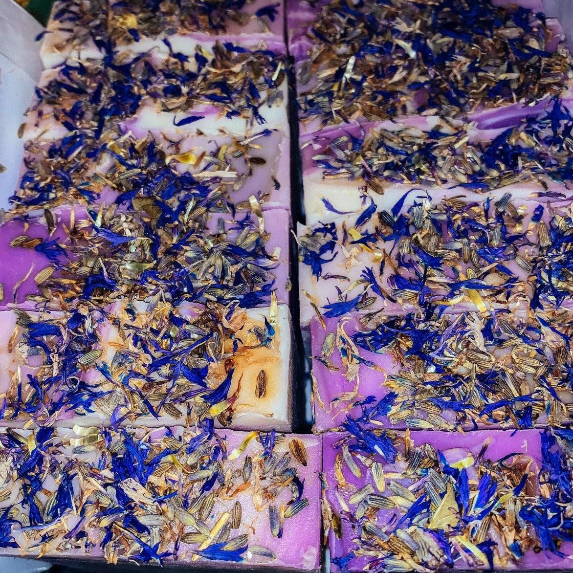 Fresh lavender with vanilla bean. Calming and meditative, this is the perfect scent to soothe the weary soul. Topped with french lavender to make that bath time even more soothing and relaxing for not only your body, but your soul.