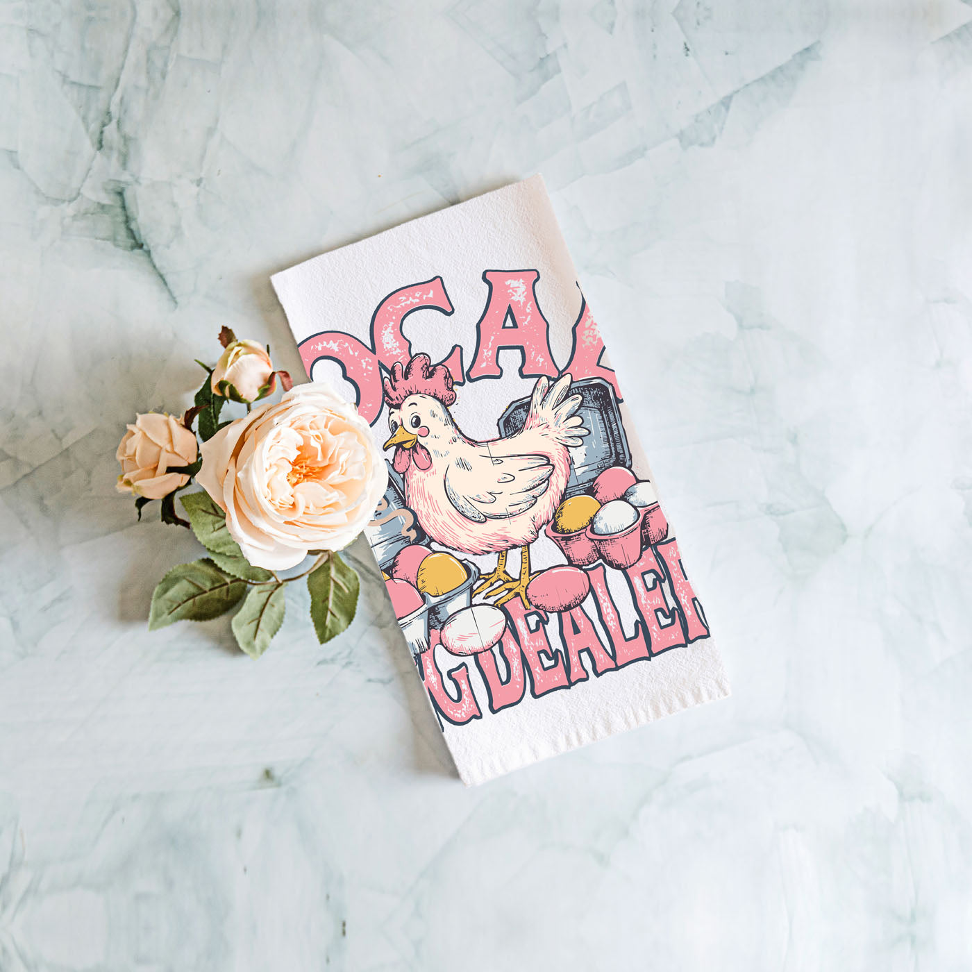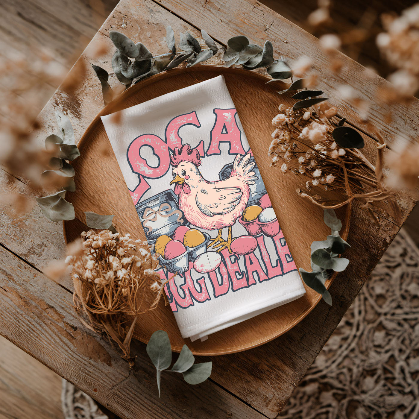 Introducing the kitchen towel that finally gives backyard chickens the street cred they deserve. Our Local Egg Dealer Kitchen Towel features the most hustler chicken you've ever seen—surrounded by fresh eggs, rocking overalls, and serving up that farm-fresh attitude with a side of sass.