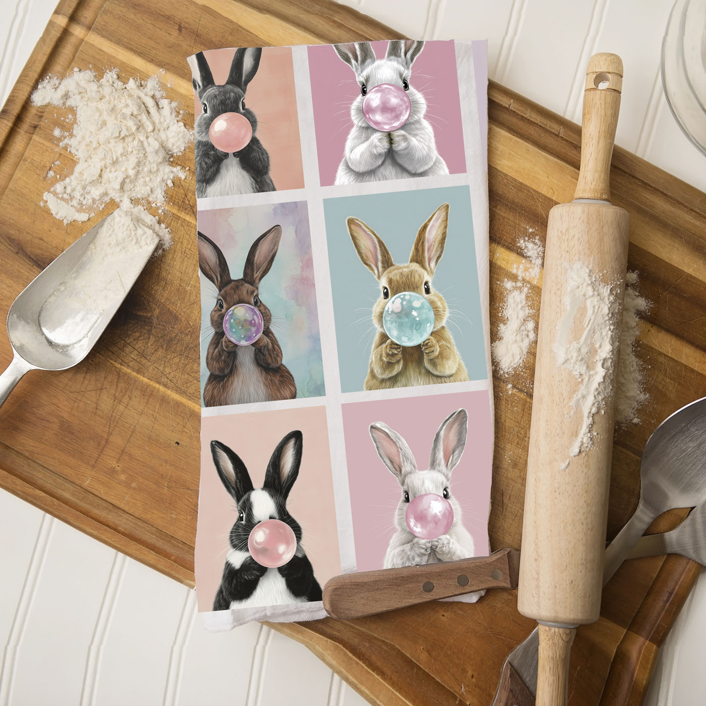 Introducing the kitchen towel that's basically a museum exhibition. Our Bunny Bubble Gum Pop Art Kitchen Towel features a grid of adorable realistic bunnies—each in their own colorful square, each blowing a perfectly round bubble gum bubble in coordinating colors. It's giving pop art. It's giving modern art gallery. It's giving "I need this framed IMMEDIATELY."