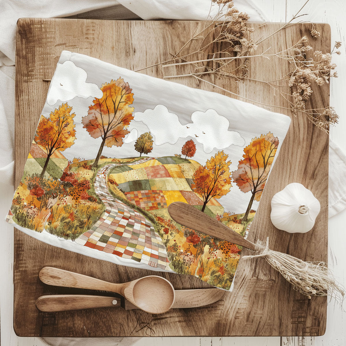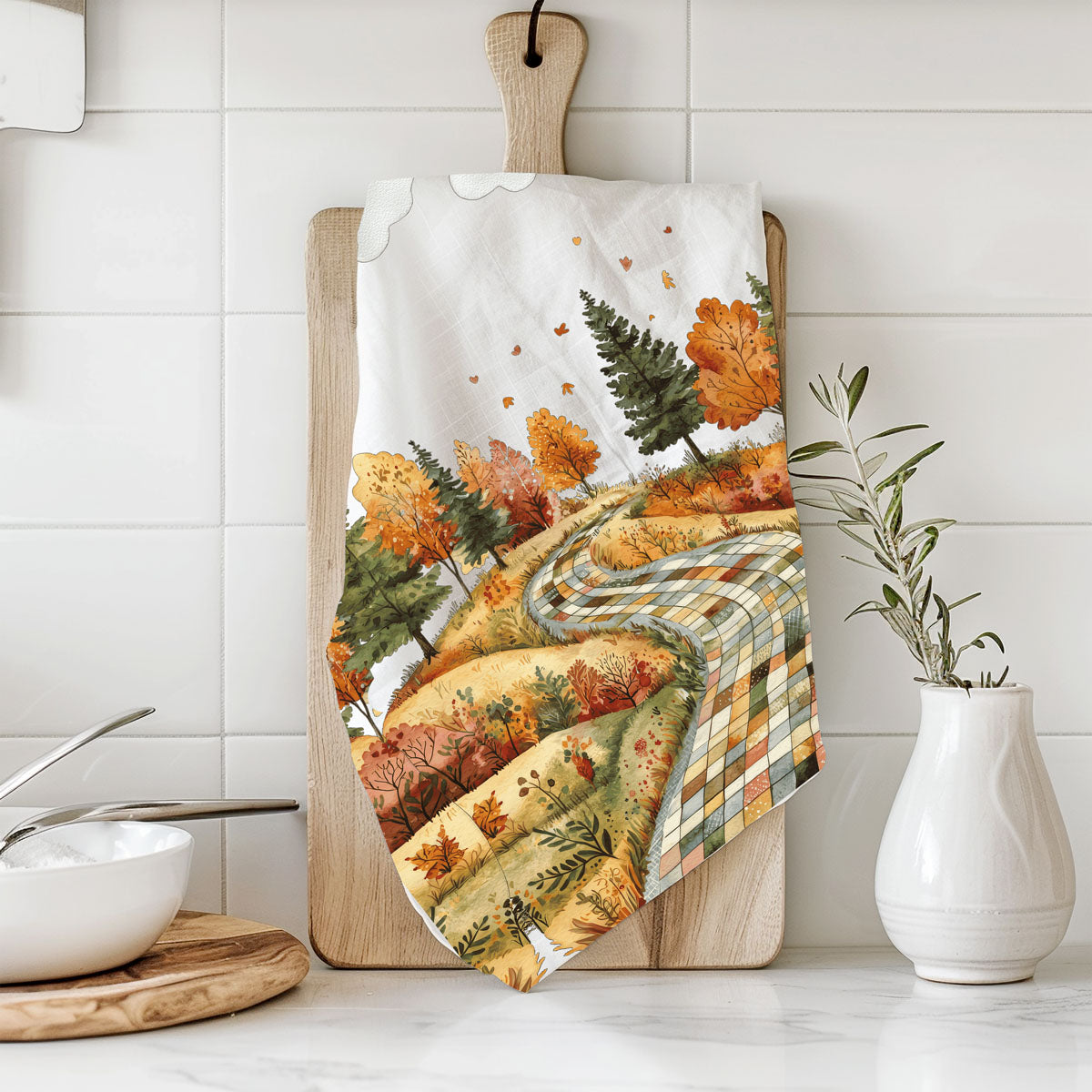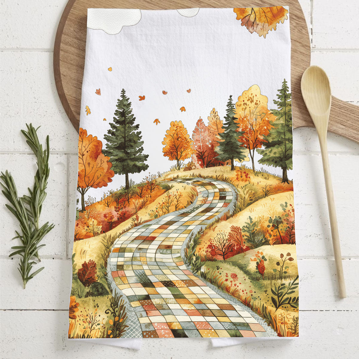 This patchwork road fall towel looks like a storybook lane made from quilt squares—winding through hills of golden trees, crunchy leaves, and all the autumn vibes your HOA wouldn’t let you put in the front yard. Hang it on your oven and boom: instant trip to a small-town Hallmark movie without having to fake-date the local lumberjack.