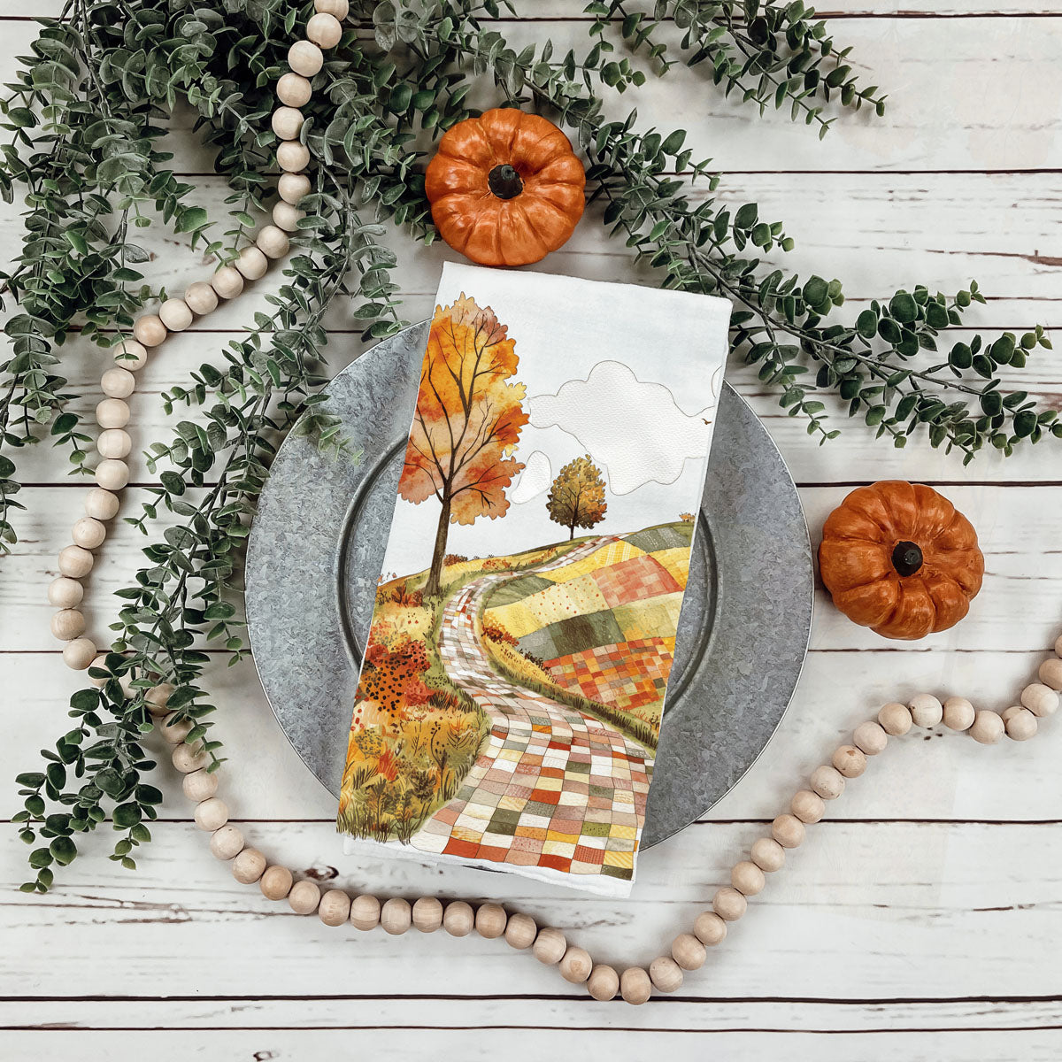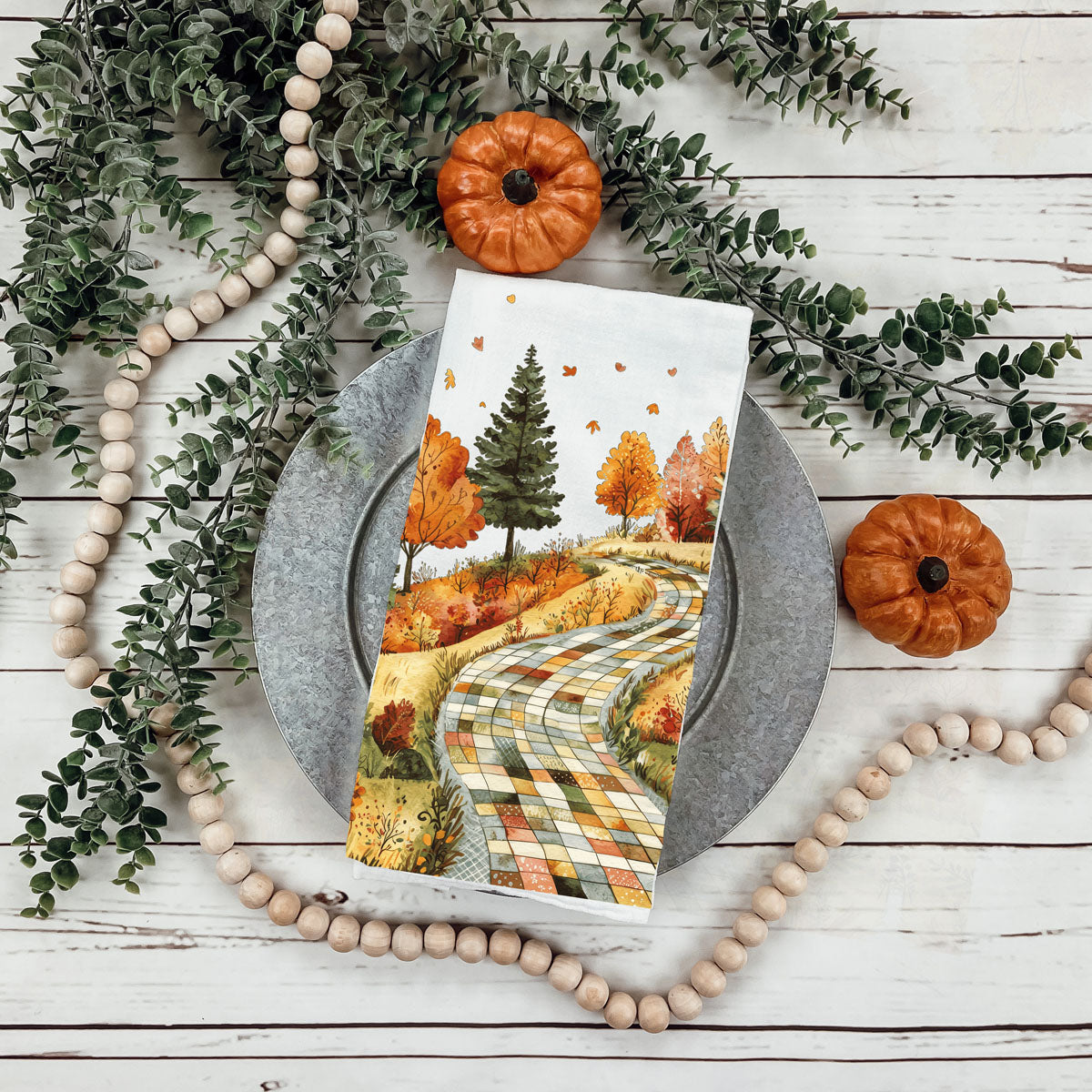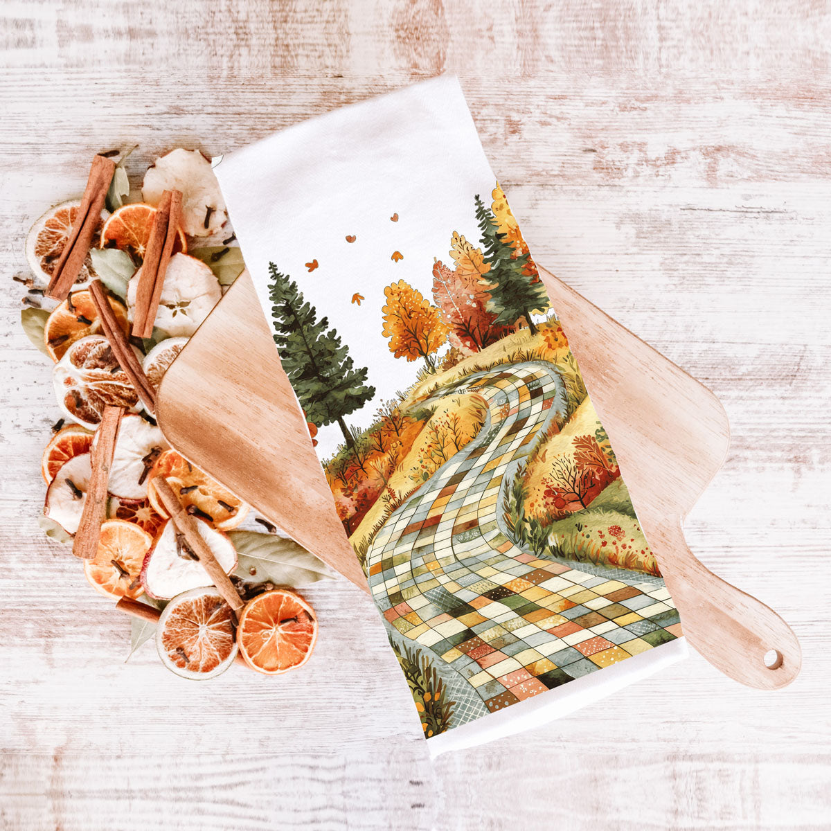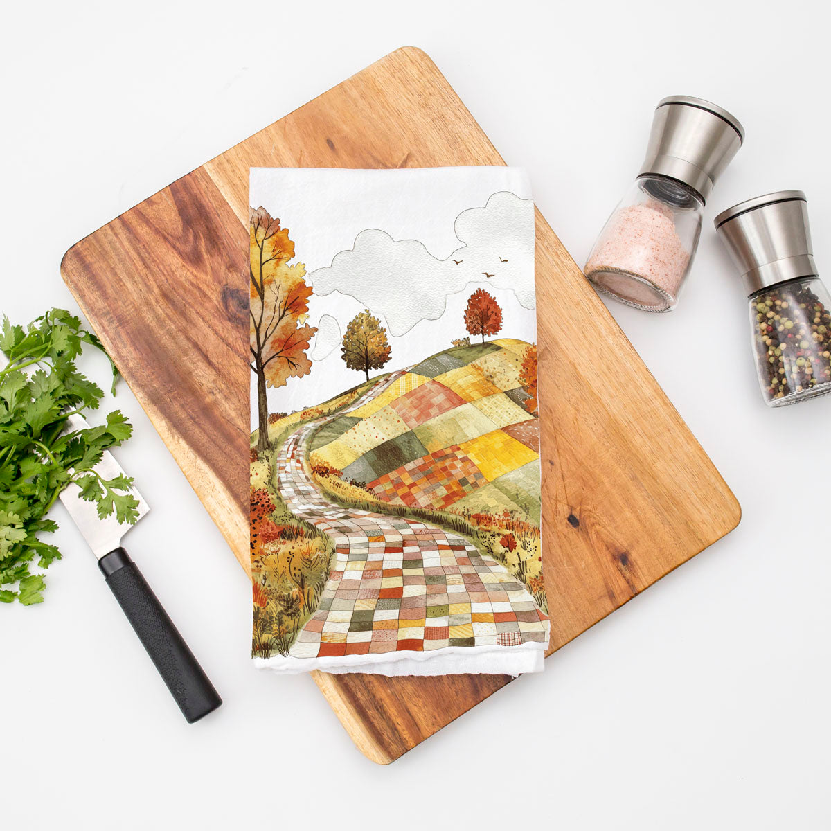 This patchwork road fall towel looks like a storybook lane made from quilt squares—winding through hills of golden trees, crunchy leaves, and all the autumn vibes your HOA wouldn’t let you put in the front yard. Hang it on your oven and boom: instant trip to a small-town Hallmark movie without having to fake-date the local lumberjack.
