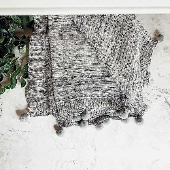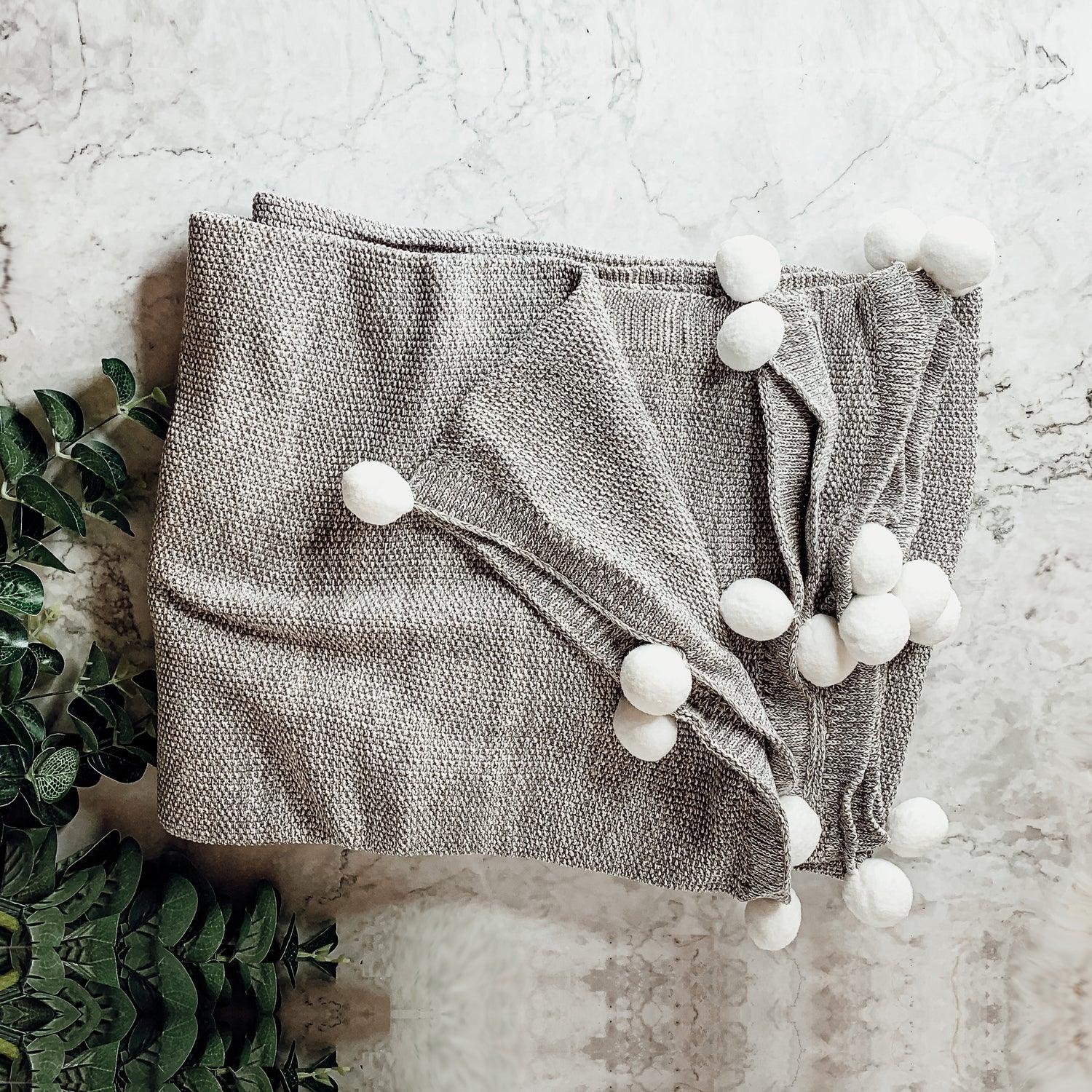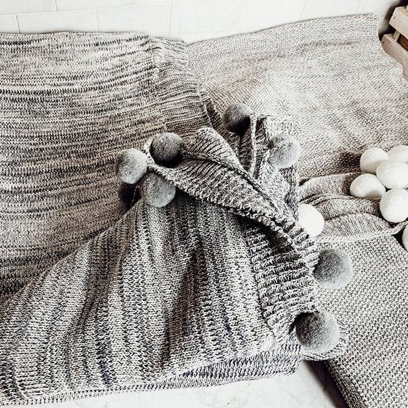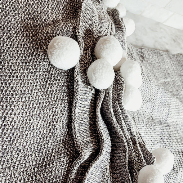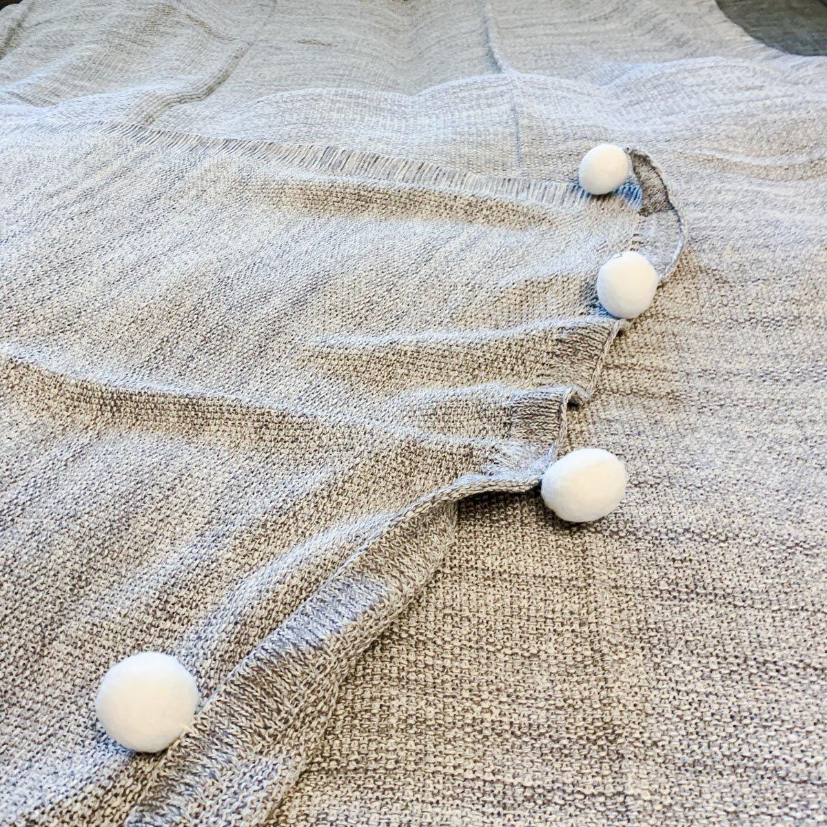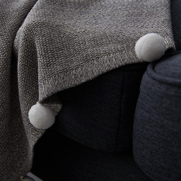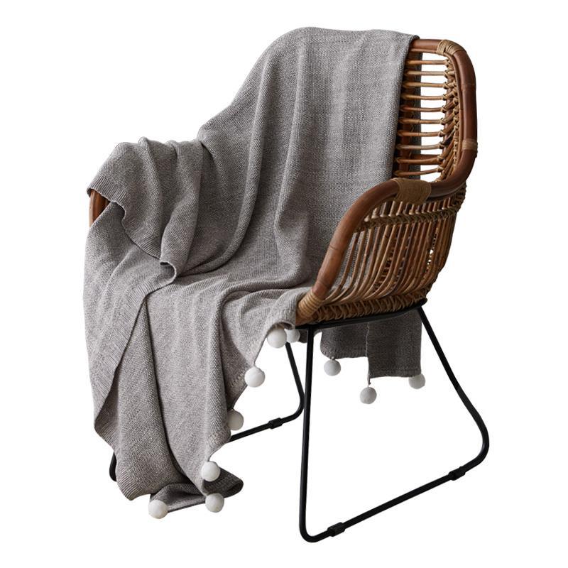 - Gray Cotton Knitted Pom Pom Throw Blanket, Premium