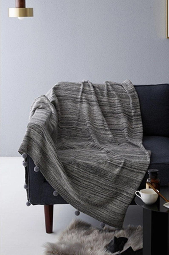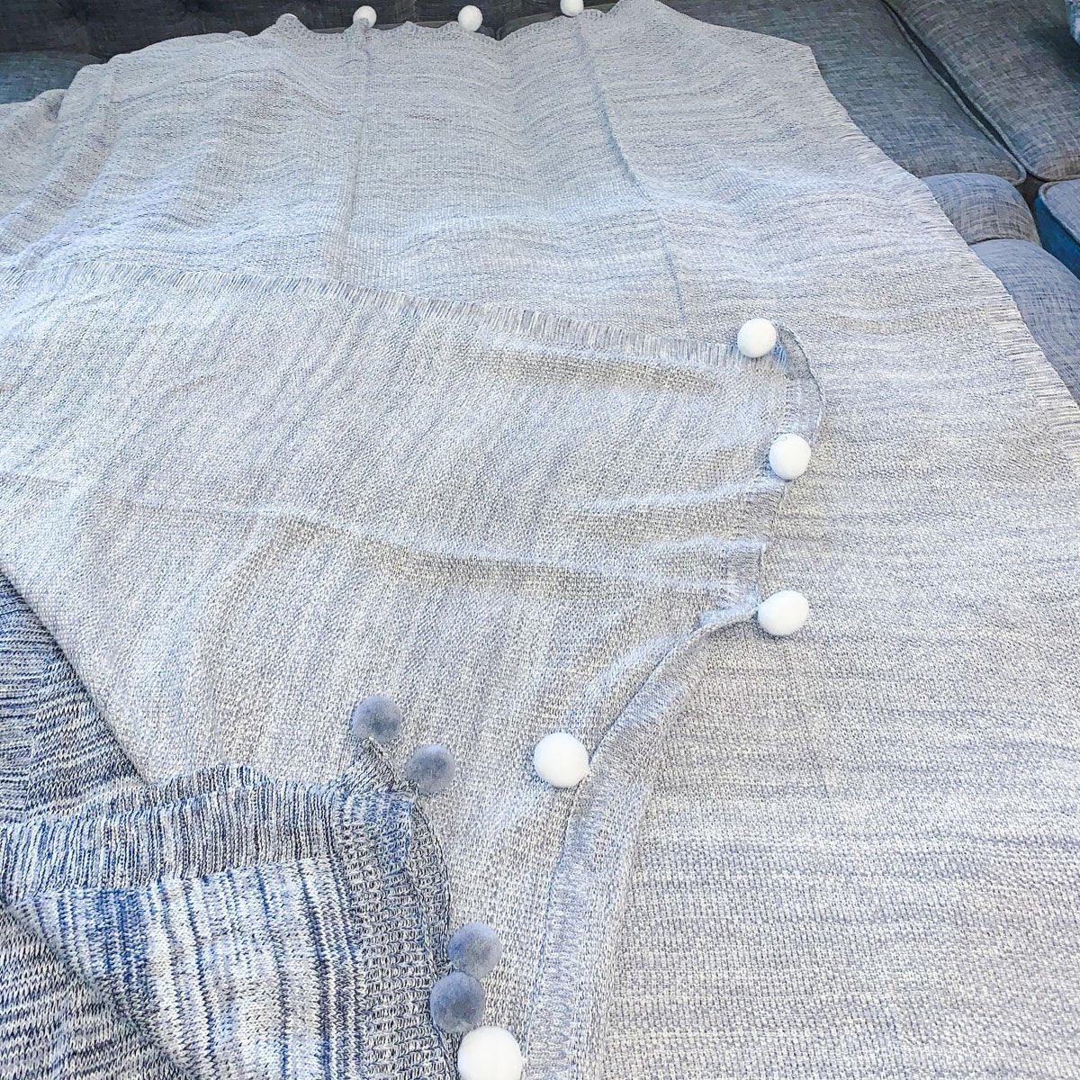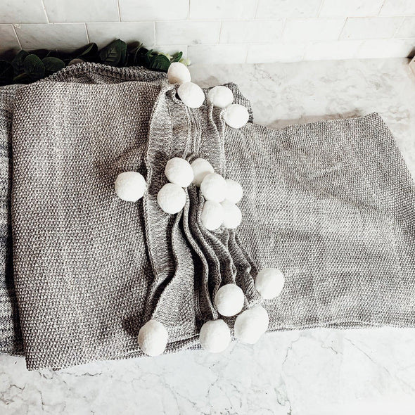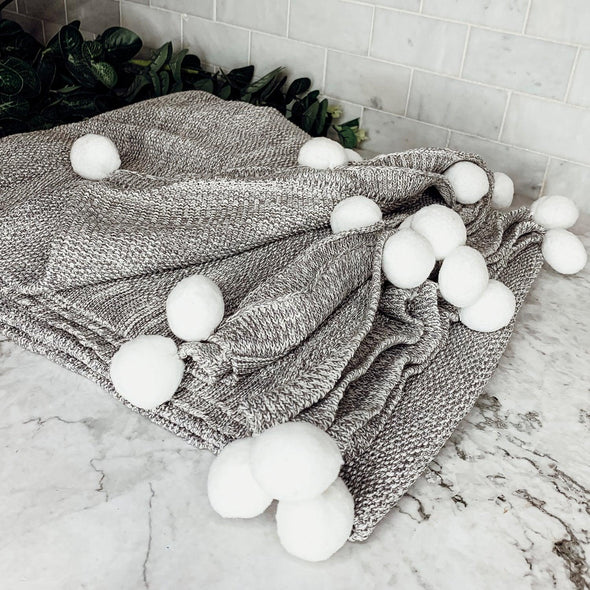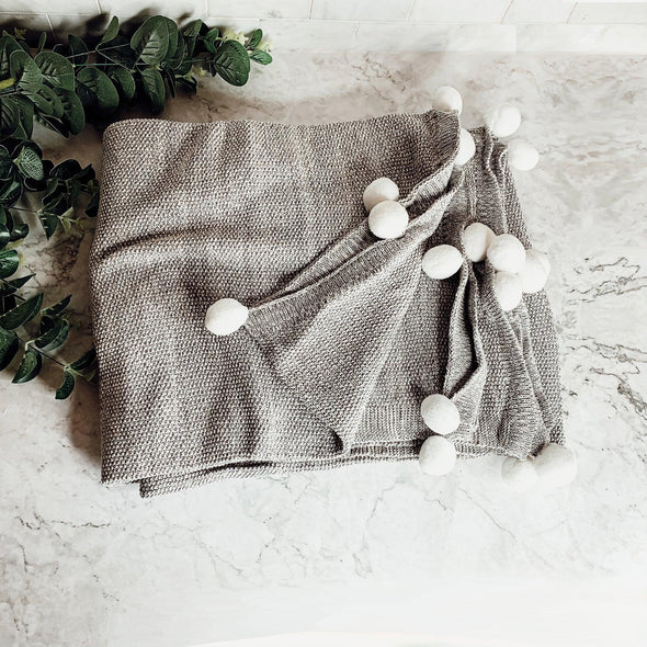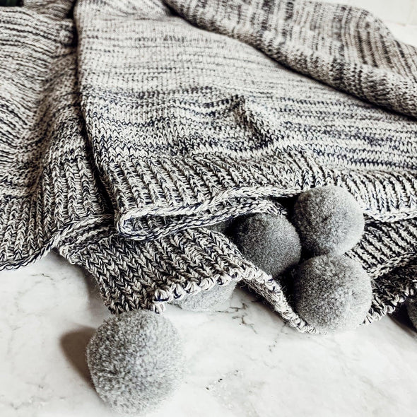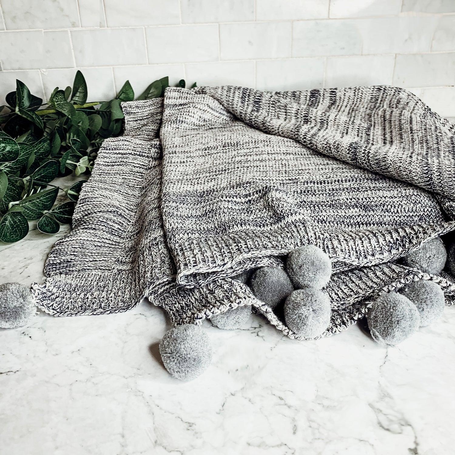 - Gray Cotton Knitted Pom Pom Throw Blanket, Premium