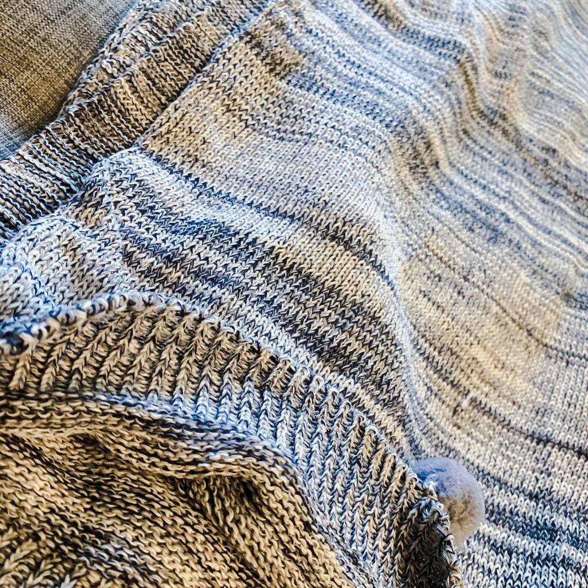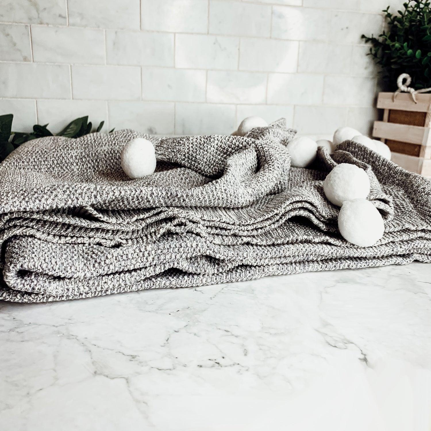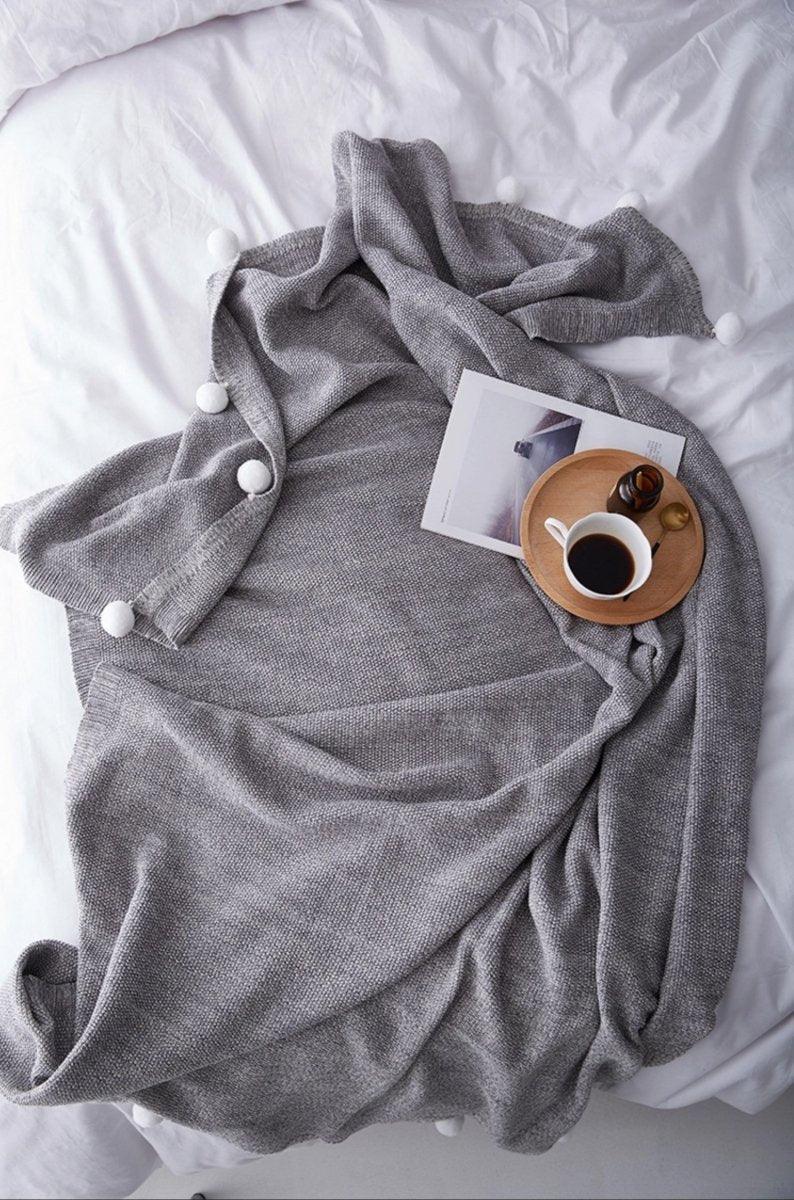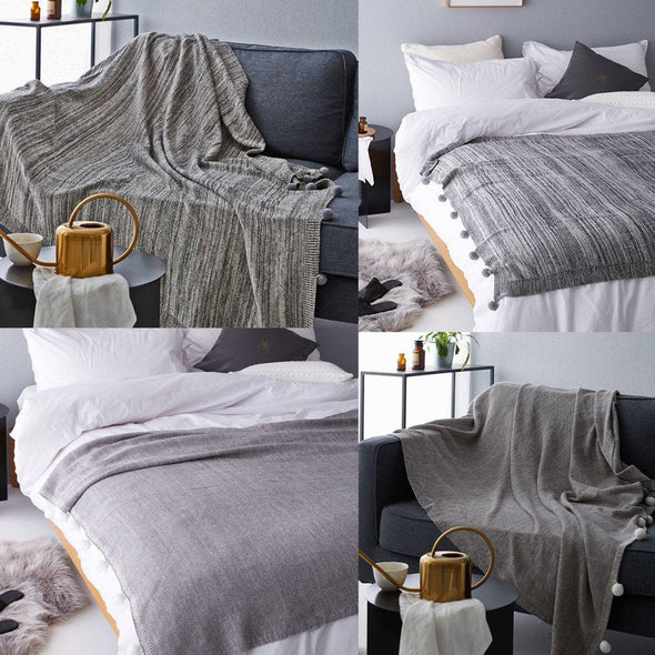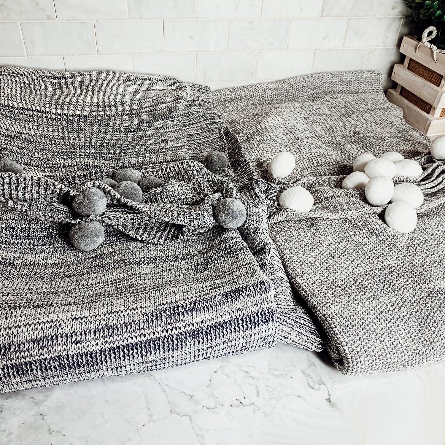 - Gray Cotton Knitted Pom Pom Throw Blanket, Premium