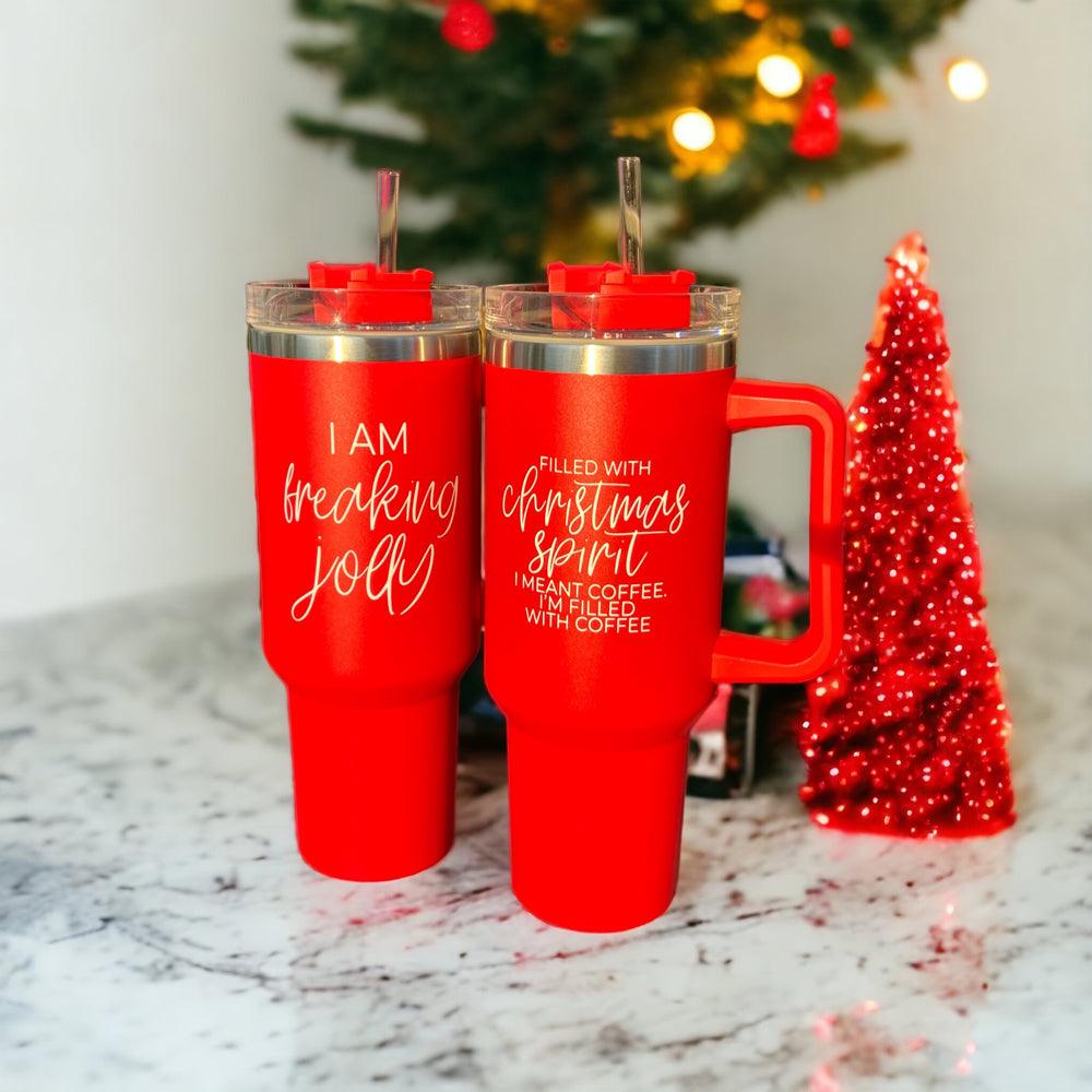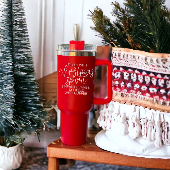 Bring one of a kind Christmas spirit (of the caffeinated variety) to every room with this hilarious 40oz red tumbler cup! With its witty holiday quote about being filled with spirit - or, ahem, coffee - this stylish cup is perfect for a jolly way to kick start your holiday season! So pour yourself a cup of cheer today!