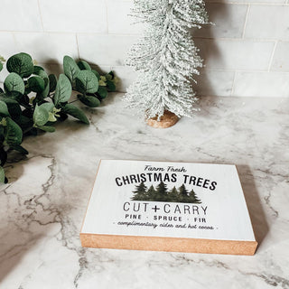 "Farm Fresh Christmas Trees Cut + Carry Pine Spruce Fir complimentary cider and hot cocoa."