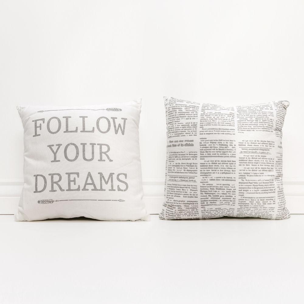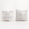 Boldly displaying "Follow Your Dreams" in the center of two Fine Arrow Silhouettes.  This Canvas Pillow May Just be What You Need to Achieve That One-Of-A-Kind Feel inside your home or office.