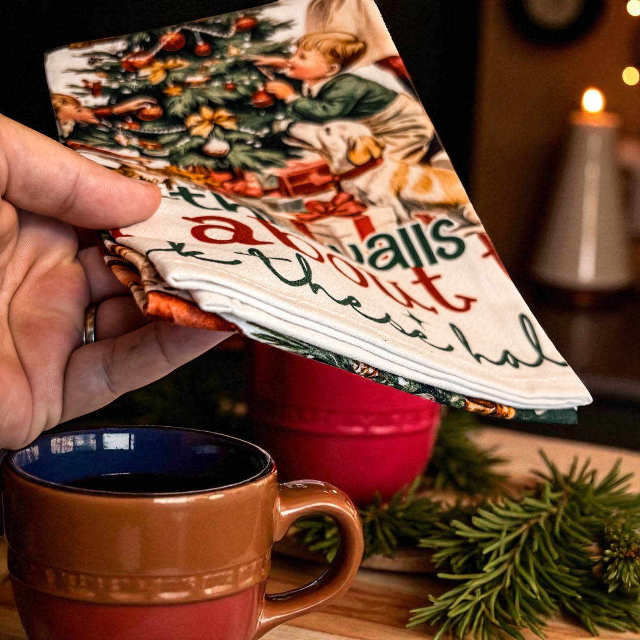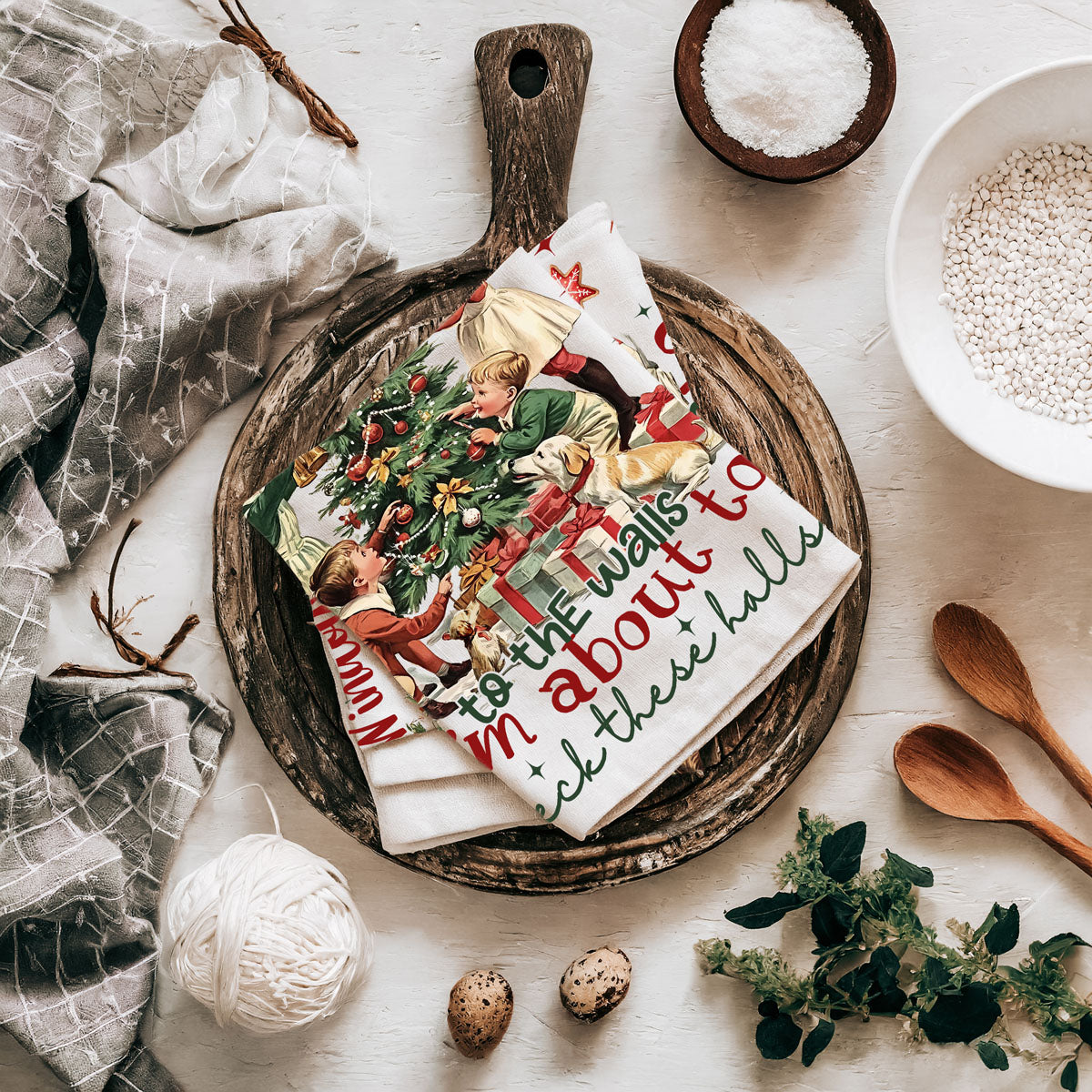 Looks like someone took the classic Christmas carol and gave it a modern twist that we absolutely didn't know we needed! Our vintage Christmas kitchen towel features adorable retro children decorating a Christmas tree with the cheeky phrase "From The Windows To The Walls I'm About To Deck These Halls" - because apparently even vintage kids had attitude.