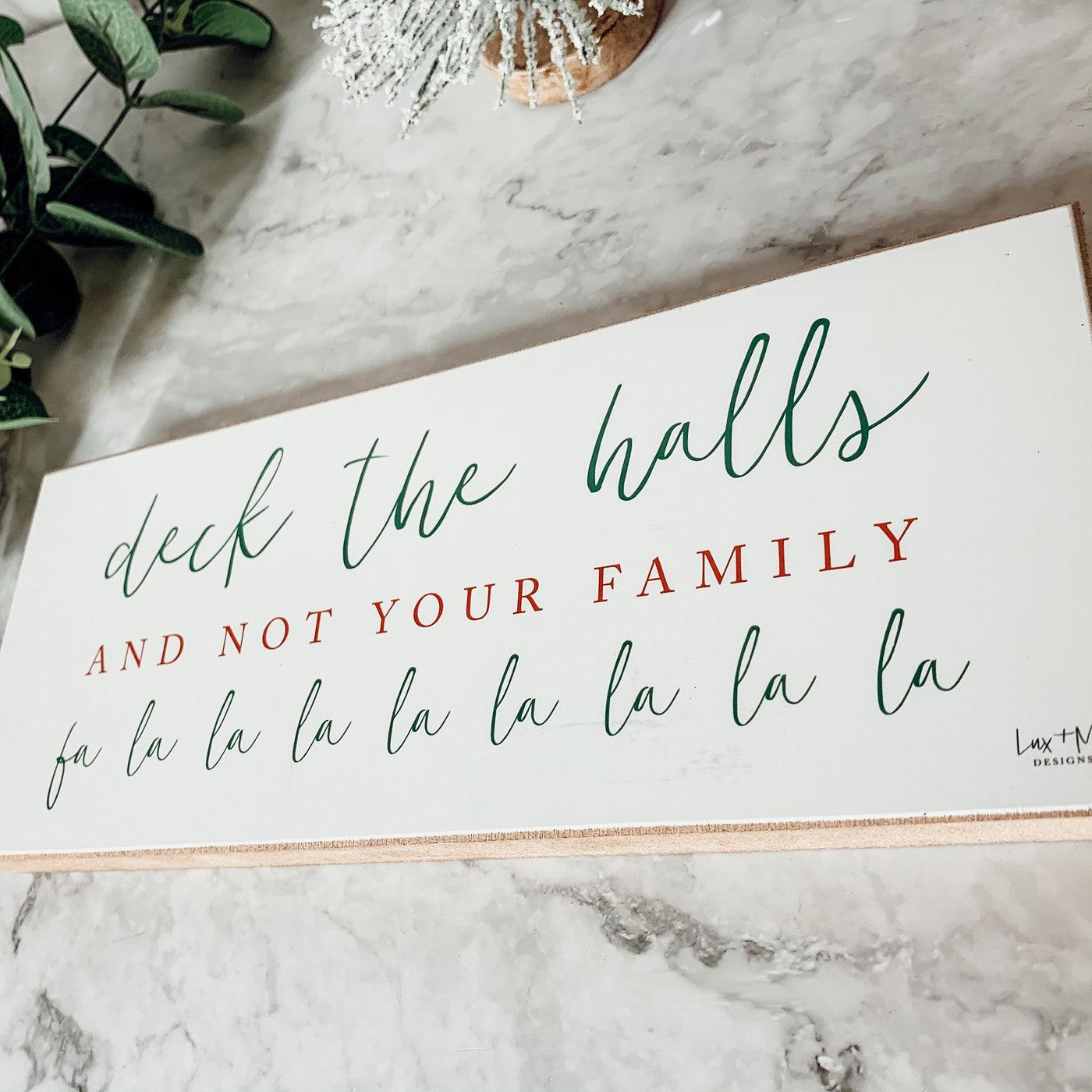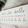 "Deck the halls and not your family fa la la la la la la la la" in  a red and green font.