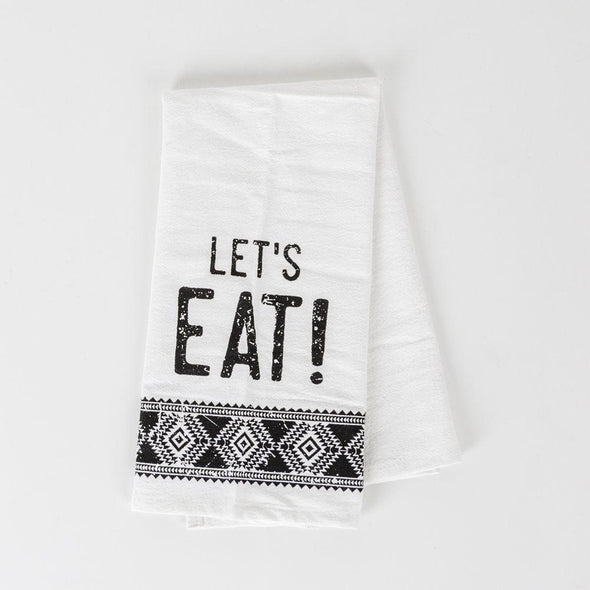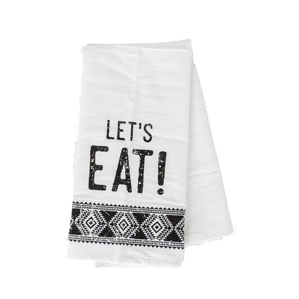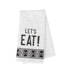 Festive tea towel features a unique Aztec design with a print that says, "Let's Eat!". Uses a pretty combination of white and black colors, which makes it suitable for any style kitchen.- 24" x 17"