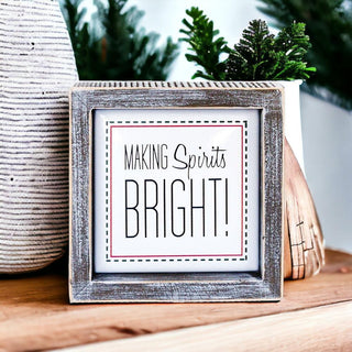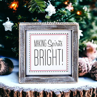 This wooden framed and Metal Embossed Sign Reads: Making Spirits Bright, with accent red border colors.