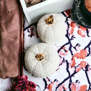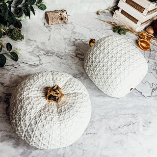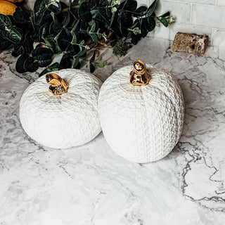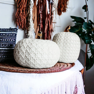 This cane weave pattern pumpkin will add a warm luster to your home or office this fall! We created an elevated take on glowing gourds, with this white and gold light up pumpkin. Perfect for decorating an entryway, tabletop or bookshelf with seasonal flair.