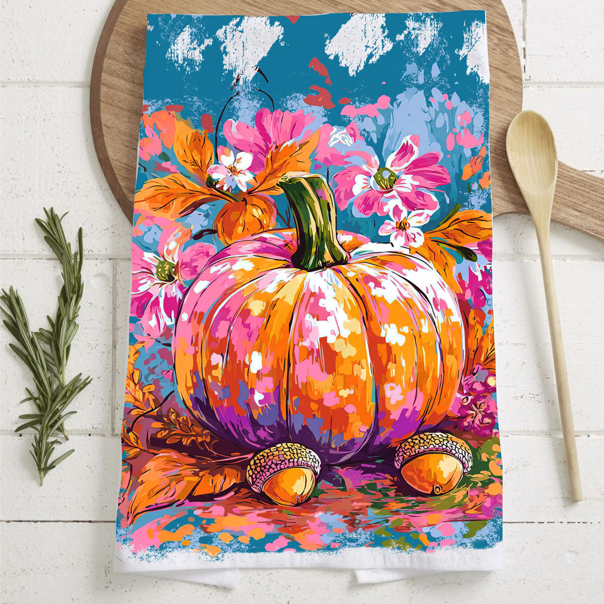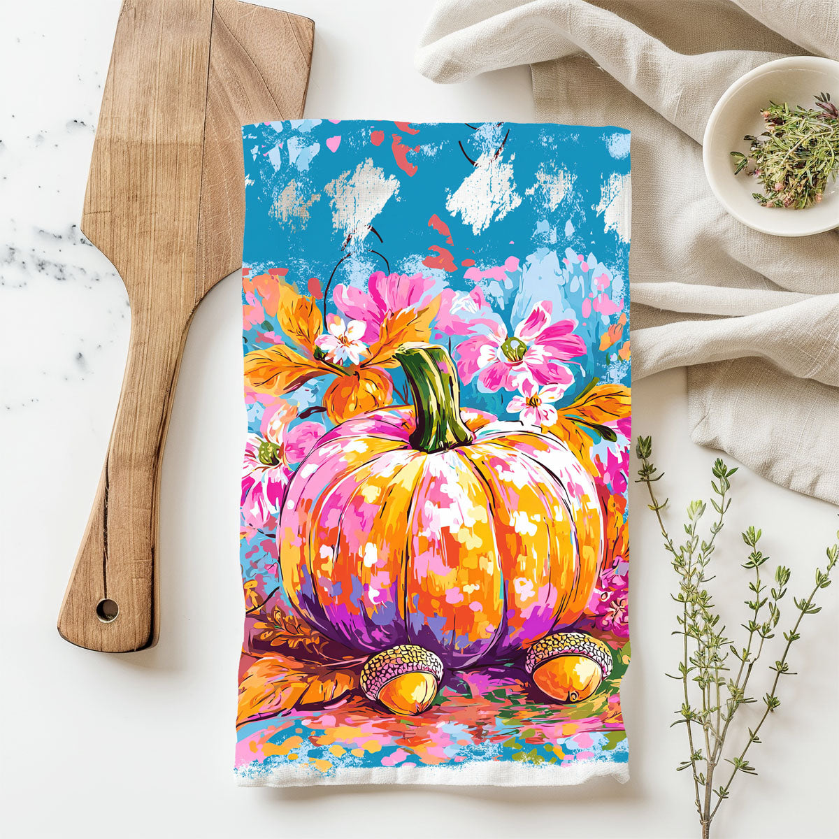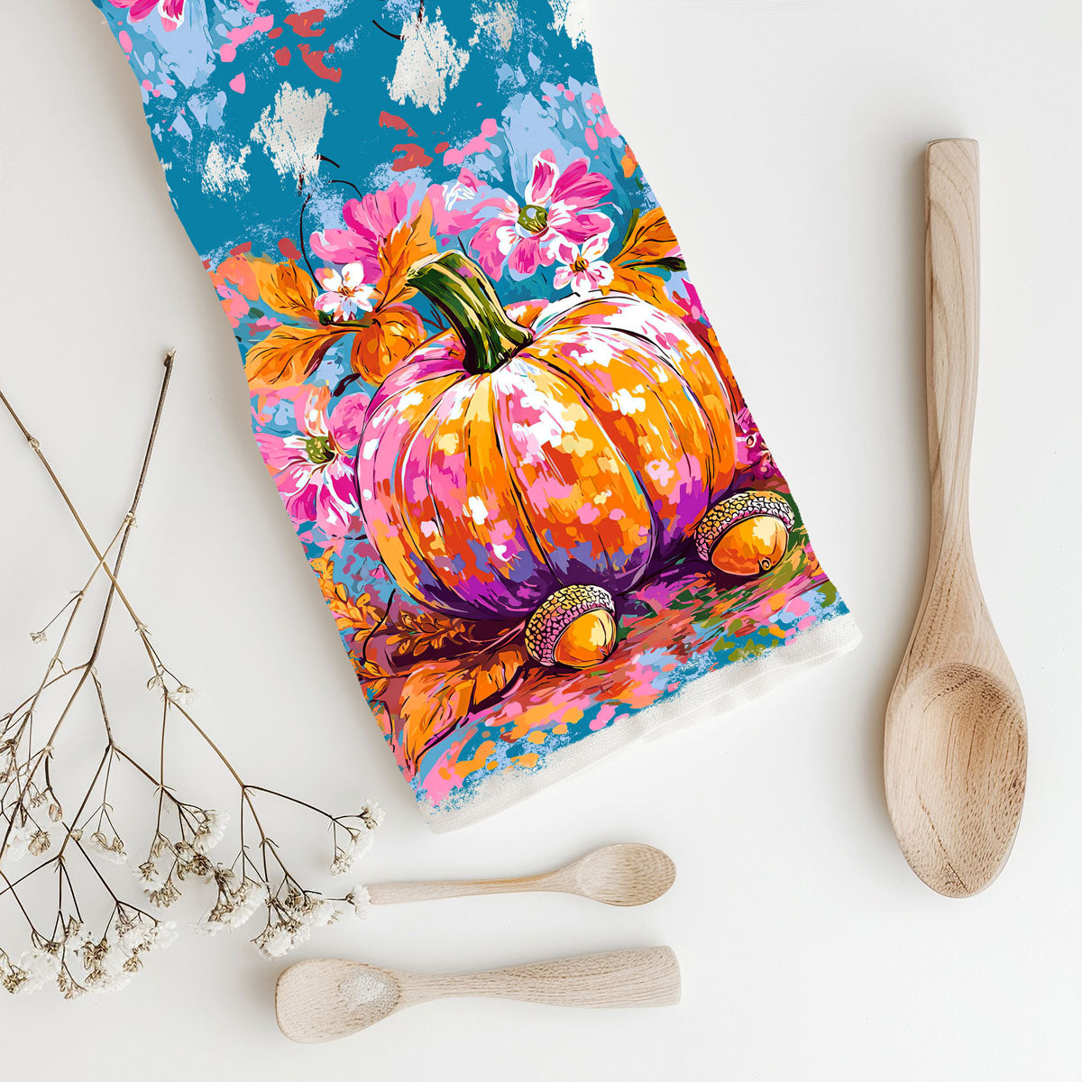 This bright watercolor pumpkin kitchen towel is what happens when a traditional pumpkin spice latte meets an art school scholarship. Neon pinks, electric oranges, punchy blues, and painterly florals make it look like you hired a boho muralist for your oven door.