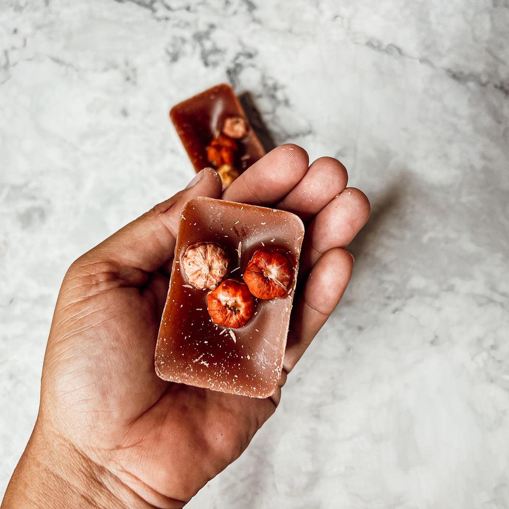 - With our natural line of melts, you can actually see the hand-ground spices that make up our wonderful scents. And while our wax melts may look a little different than traditional melts, the colors come from the spices themselves, not from synthetic dyes. Each melt is coated with spices that are ground by hand to ensure the freshest ingredients into each product!