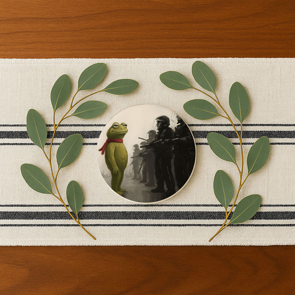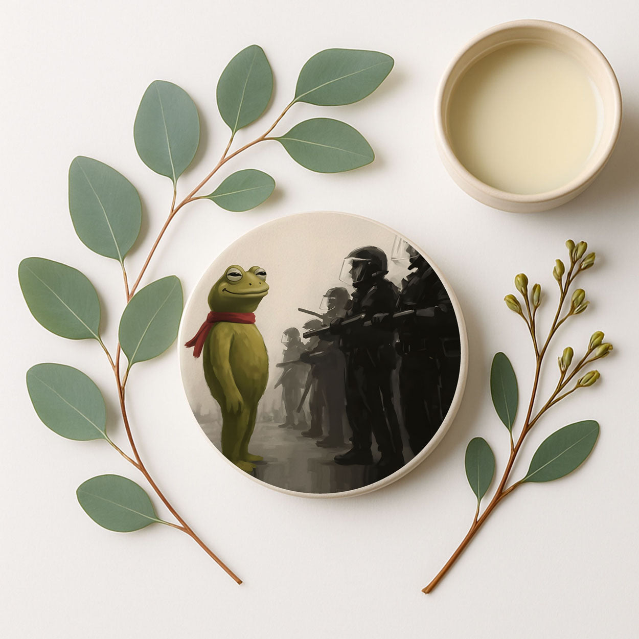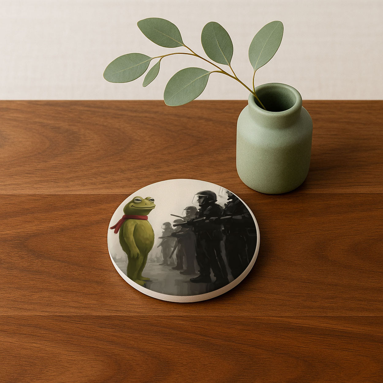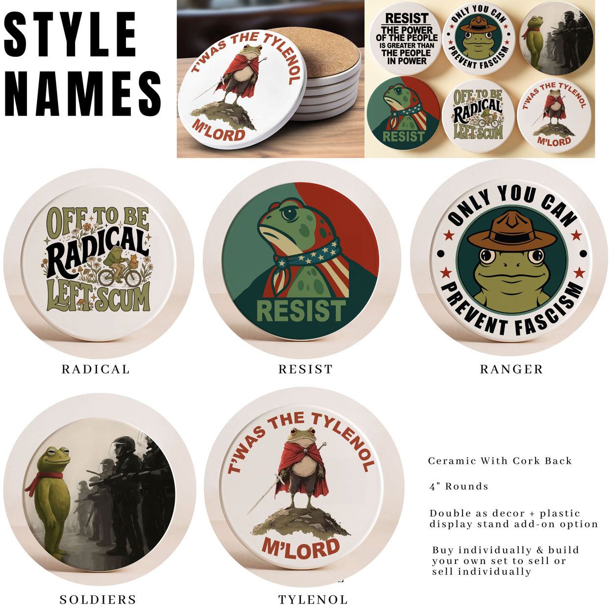 These political frog coasters are for the person whose love language is iced coffee and overthrowing authoritarian vibes. Each 4" ceramic coaster (with cork back, because we respect furniture and civil liberties) features a different heroic amphibian: