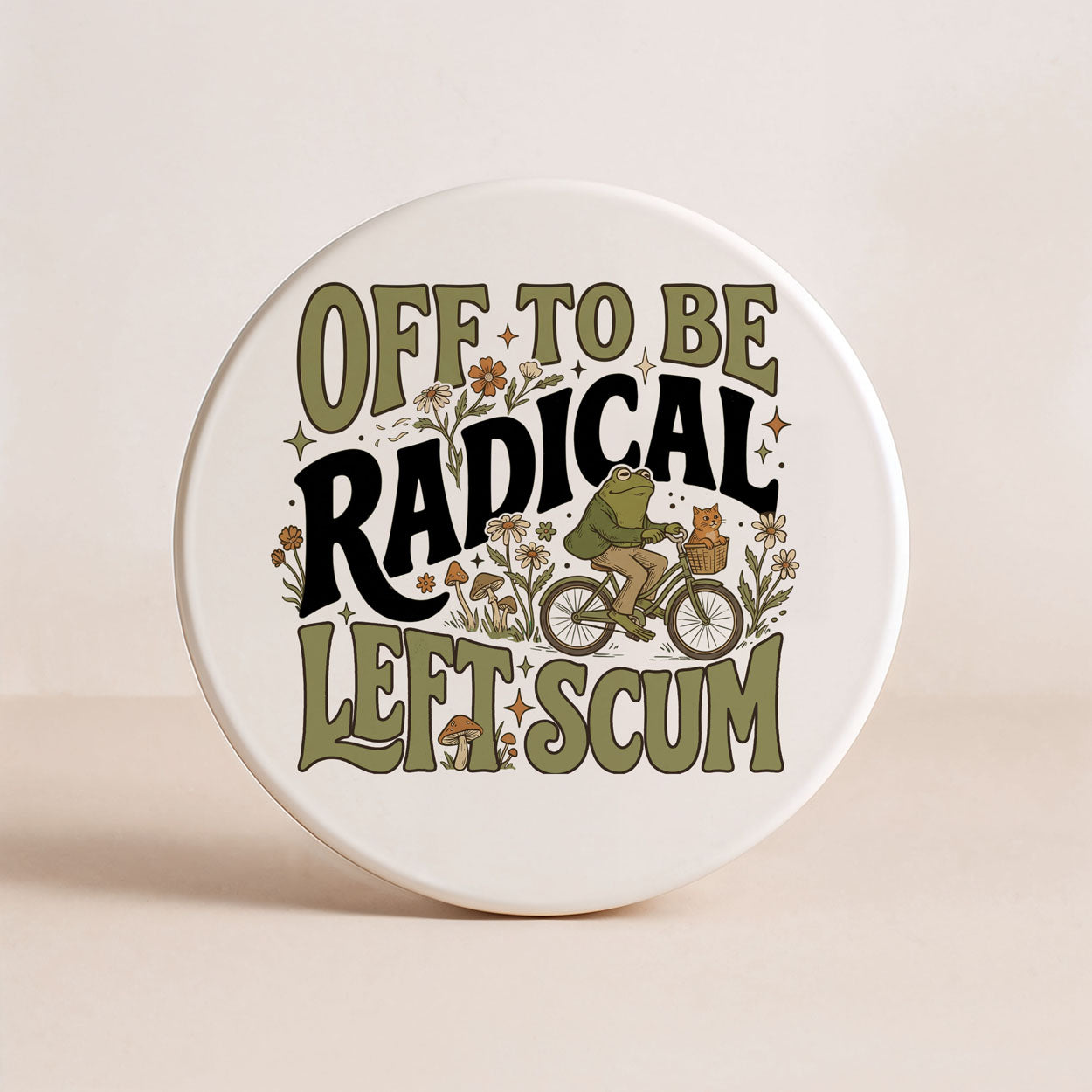 - Radical – “Off to be radical left scum” on a bike, probably headed to recycle and pay workers fairly.