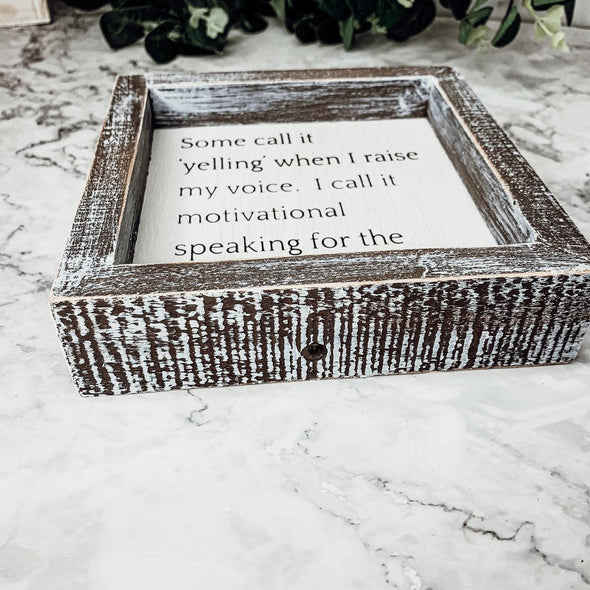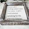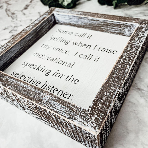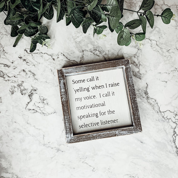 - Reads: "Some call it 'yelling' when I raise my voice. I call it motivational speaking for the selective listener."