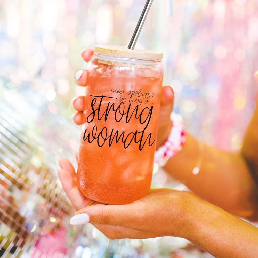 Our glasses with bamboo tops. Drink it with the top and straw of choice, remove the bamboo lid and drink straight from the glass.